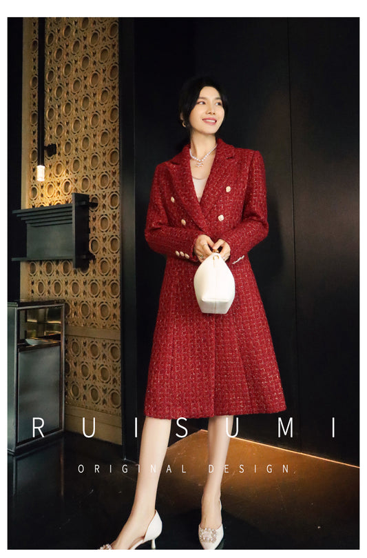Ruisumi Winter New Red Stitching Coat Retro Suit High Waist Slim Medium Length Wool Coat- San