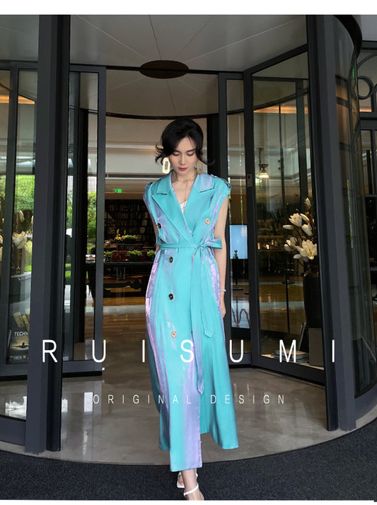 Design French light luxury sky blue suit collar sleeveless windbreaker vest long dress- Dio