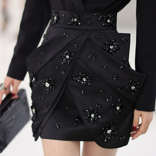 Handmade Be-jeweled stone diamonds cocktail high-waisted short black skirt - mimi