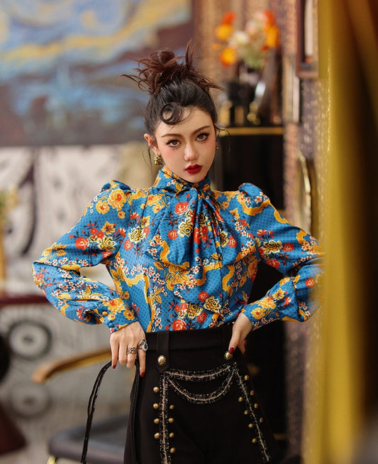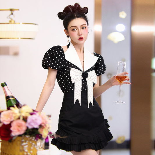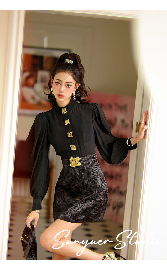 Retro Hepburn inspired black high waist pleated skirt puff sleeves chiffon top two piece suit set- Chia