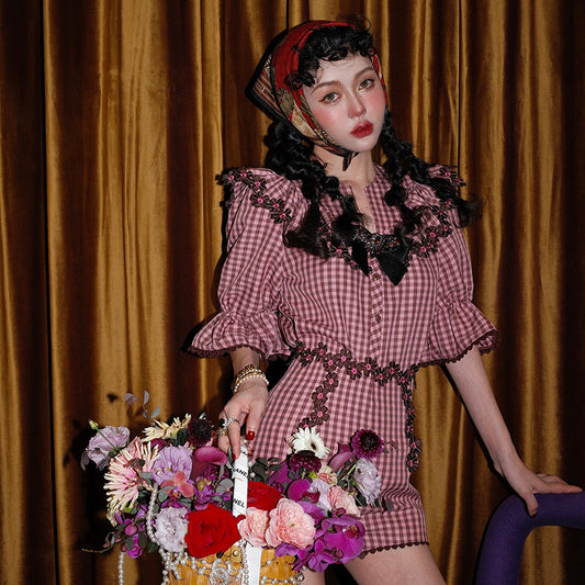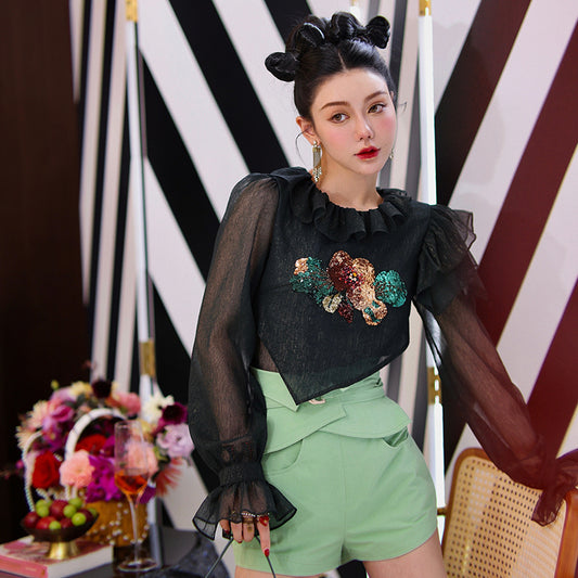 Hand-embroidered lotus leaf high-end design chiffon top & high waist wide-leg design shorts two piece suit set- Sinia