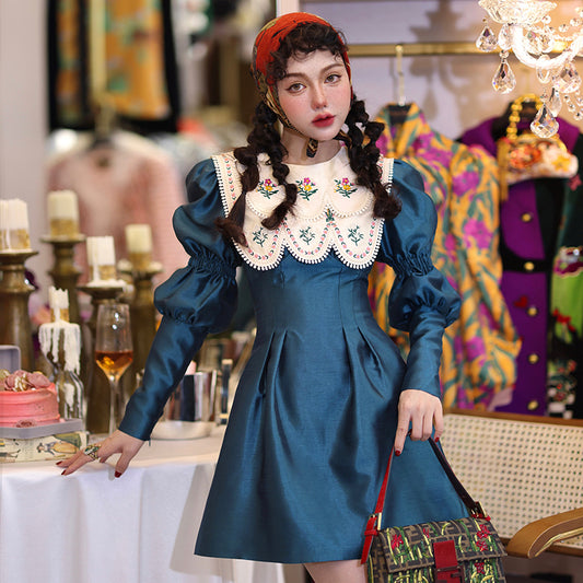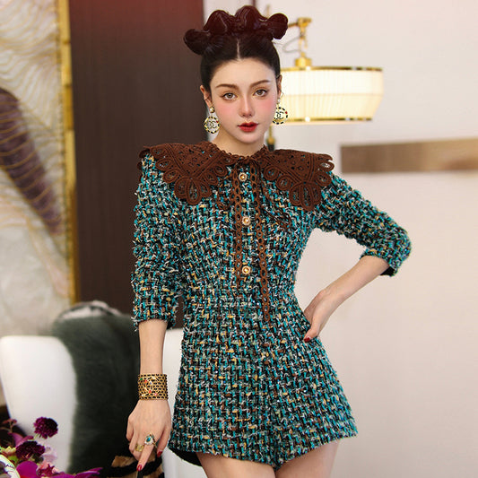 Exquisite blue long sleeve wool high-end luxury short jumpsuit - Pio