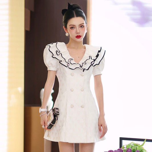 Black gold buttons embroidered beaded bow long-sleeved dress- Otia