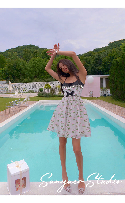 Three-dimensional oversized rhinestones print bow high waist dress- Tore