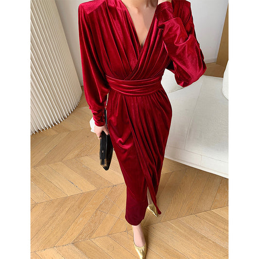 WANXO French red pleated velvet dress new gold-like waist bottoming skirt- Winny