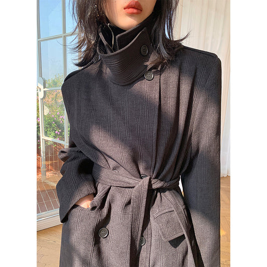 Black WANXO color stand collar corduroy coat new loose medium and long woolen coat- Sala