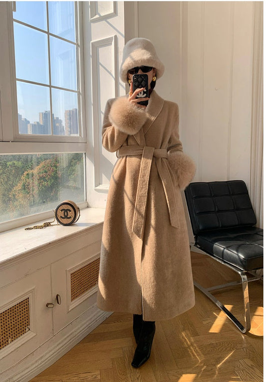 WANXO vegann fur waist tie woolen coat new fashion medium and long woolen coat- Katy