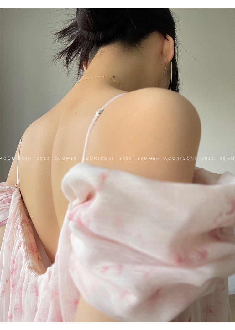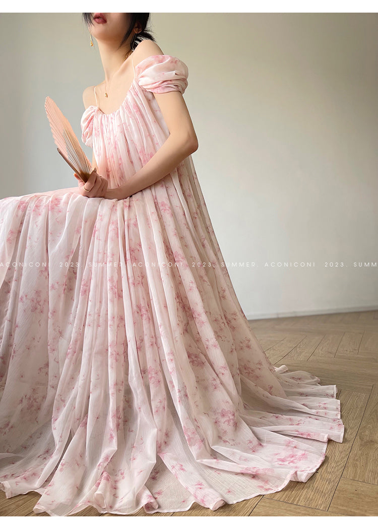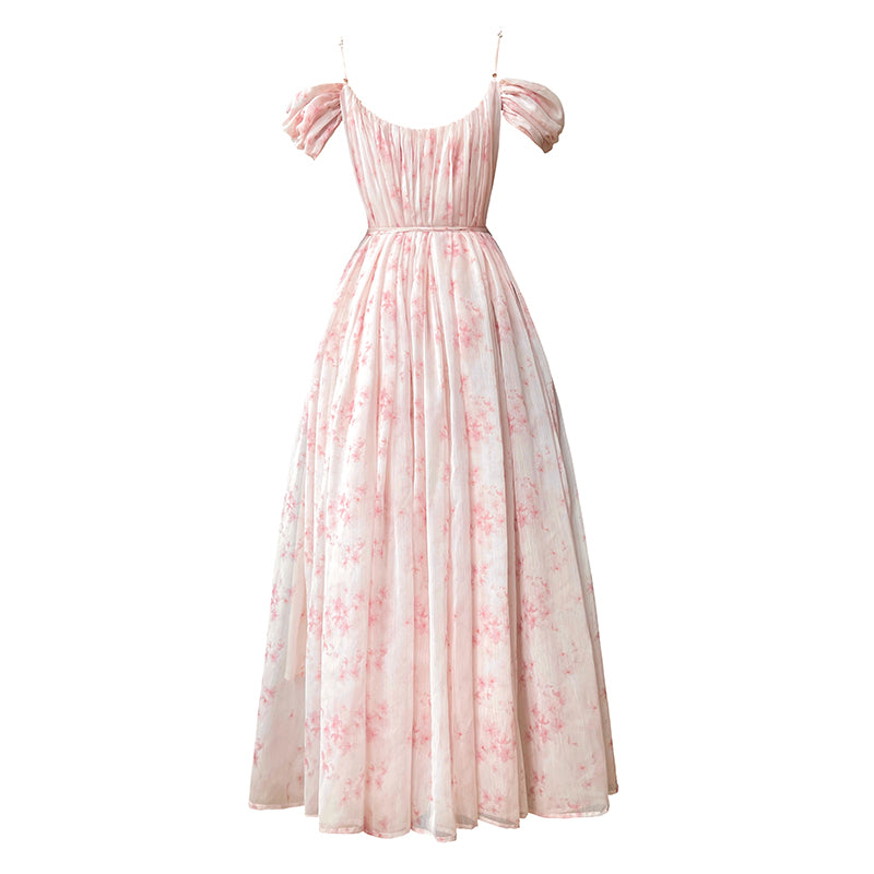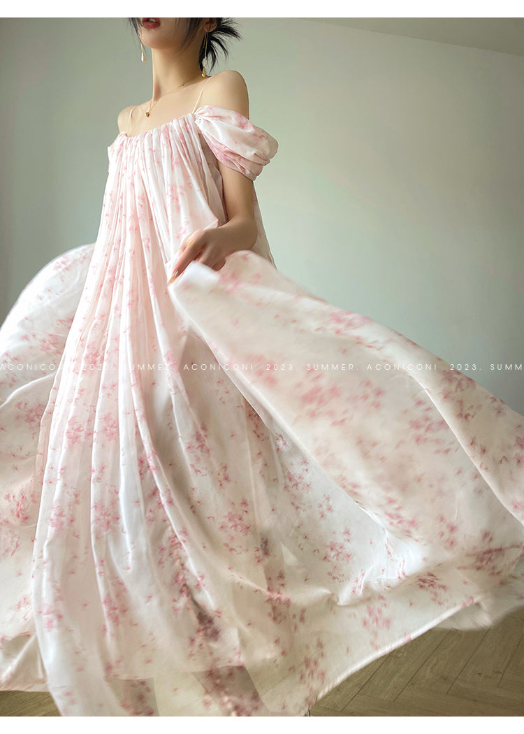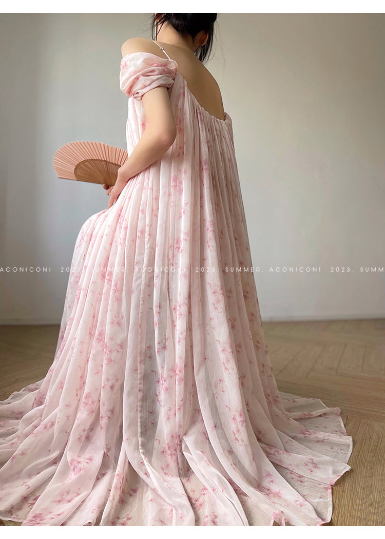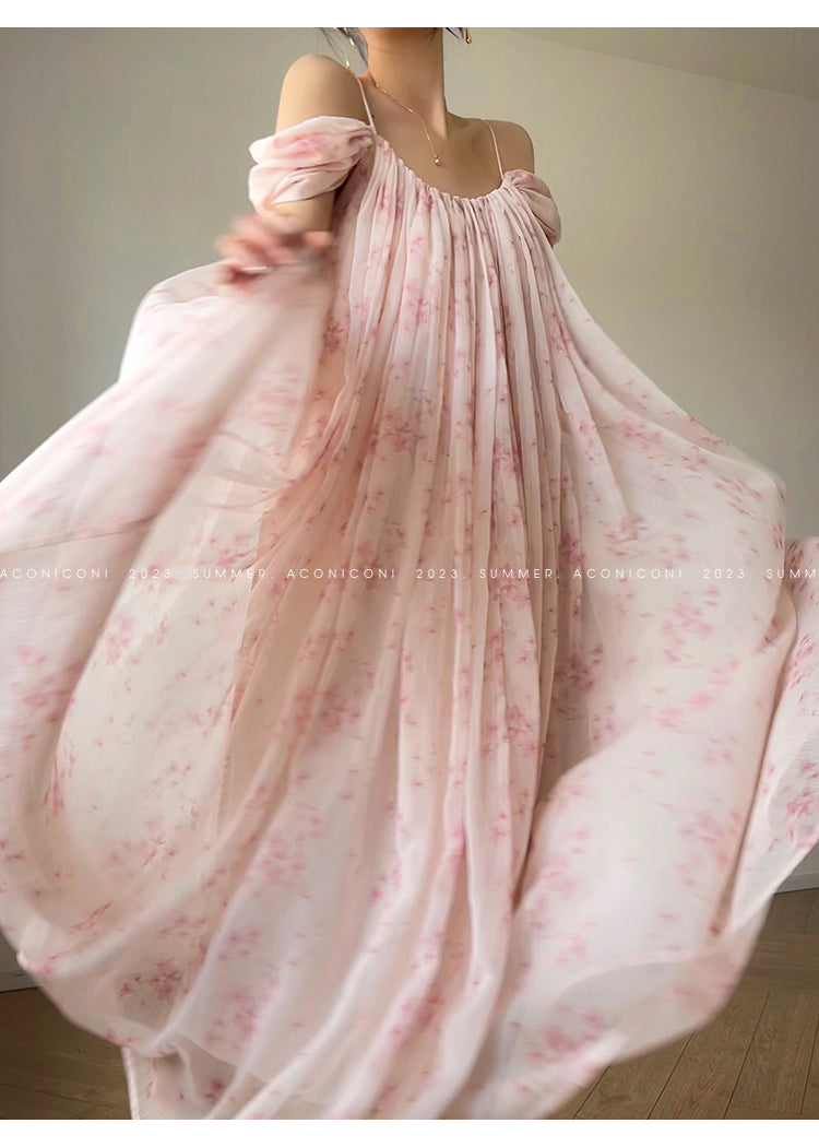 fabric is cool and breathable, has good perspiration function. This breathable fabric is comparable to natural silk, and is easy to care for, and its performance is better than natural silk. It is delicate and comfortable to wear, breathable with printed pink cherry blossoms in full bloom. It is gentle and romantic suspender design, very thin shoulder straps, exquisite and elegant. Adjustable shoulder straps, and adjustable sleeves, which are naturally stacked, presenting a natural draping sleeve shape to cover arm, and a naturally tailored curved neckline. The skirt is light, elegant and natural. The side seams are zippered for easy on and off. The inner lining is made of 160D chiffon fabric, which is light and breathable.