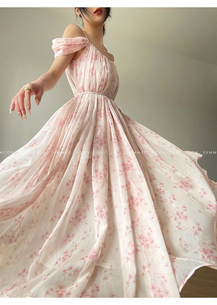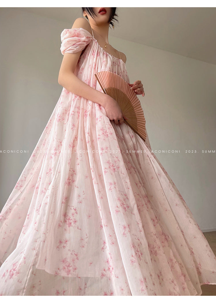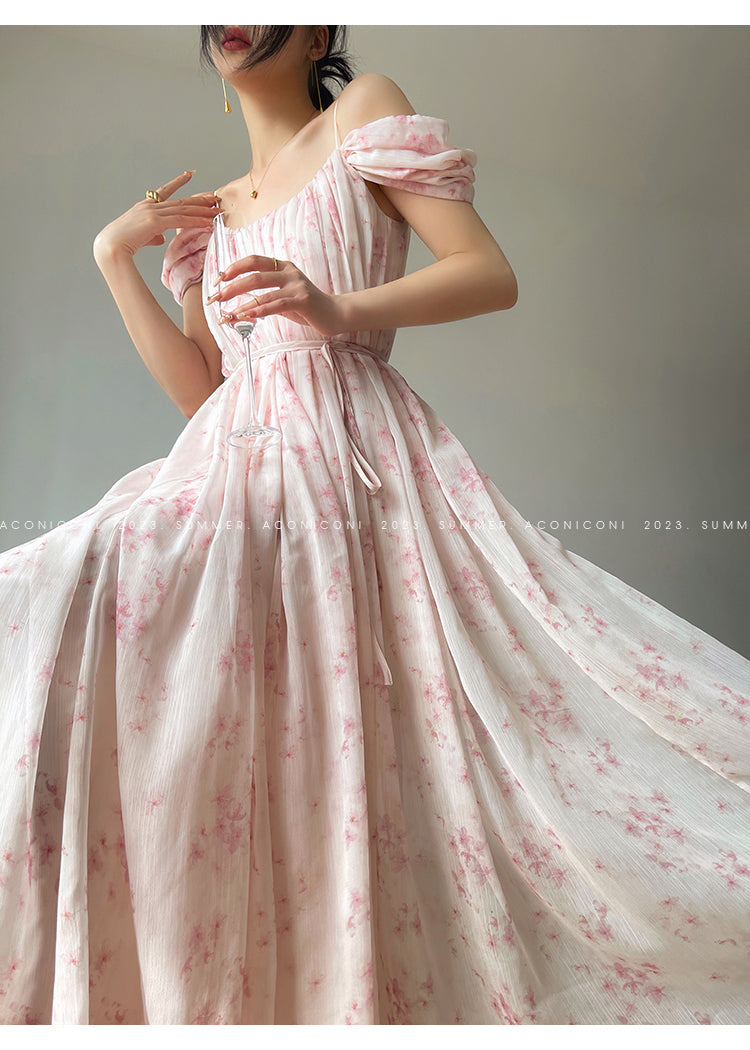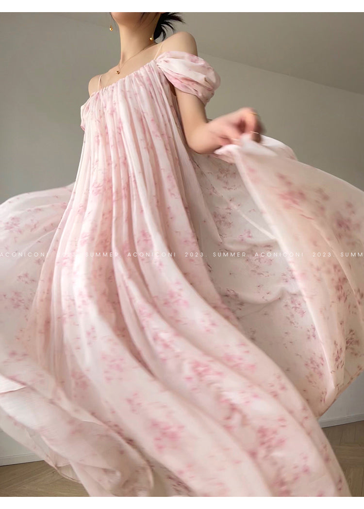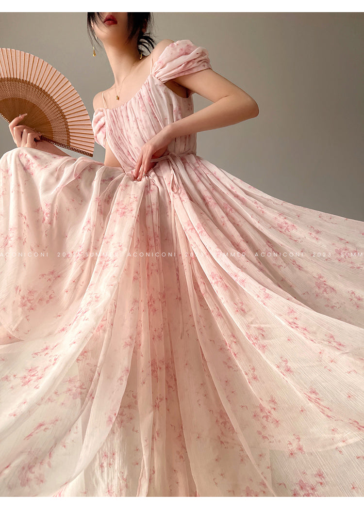 fabric is cool and breathable, has good perspiration function. This breathable fabric is comparable to natural silk, and is easy to care for, and its performance is better than natural silk. It is delicate and comfortable to wear, breathable with printed pink cherry blossoms in full bloom. It is gentle and romantic suspender design, very thin shoulder straps, exquisite and elegant. Adjustable shoulder straps, and adjustable sleeves, which are naturally stacked, presenting a natural draping sleeve shape to cover arm, and a naturally tailored curved neckline. The skirt is light, elegant and natural. The side seams are zippered for easy on and off. The inner lining is made of 160D chiffon fabric, which is light and breathable.