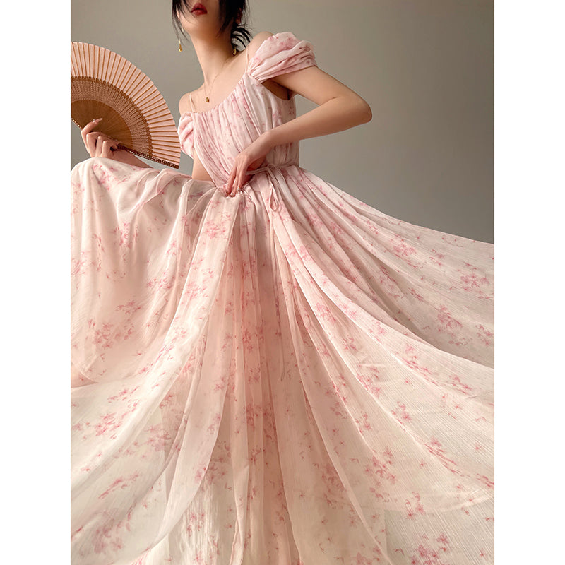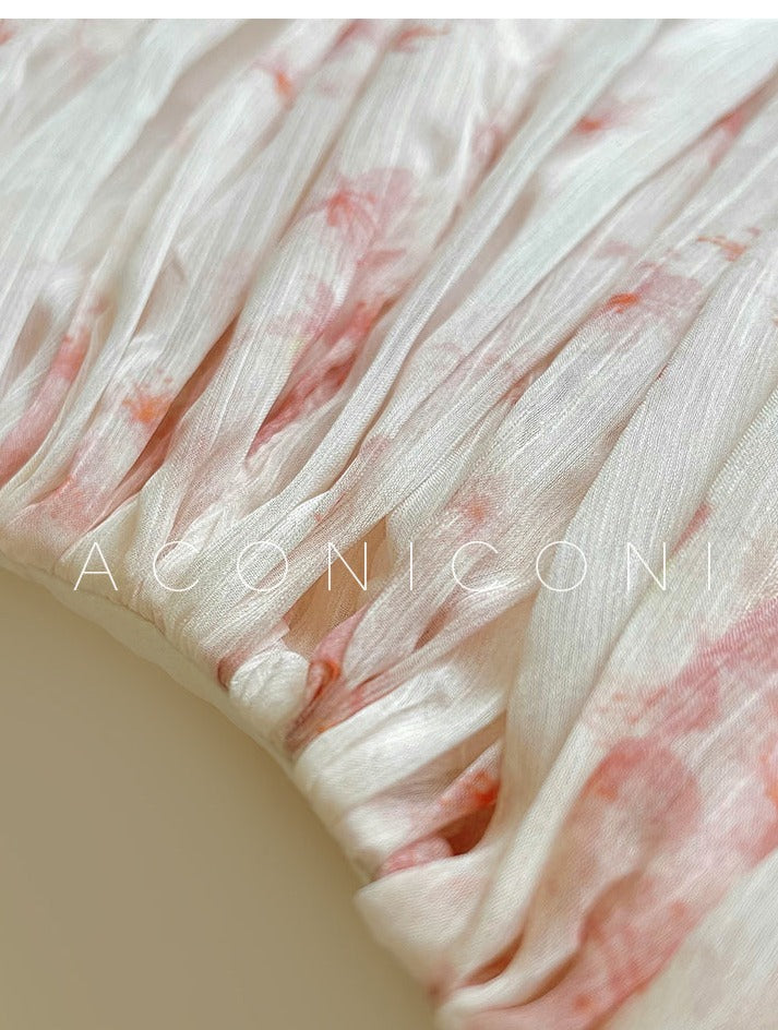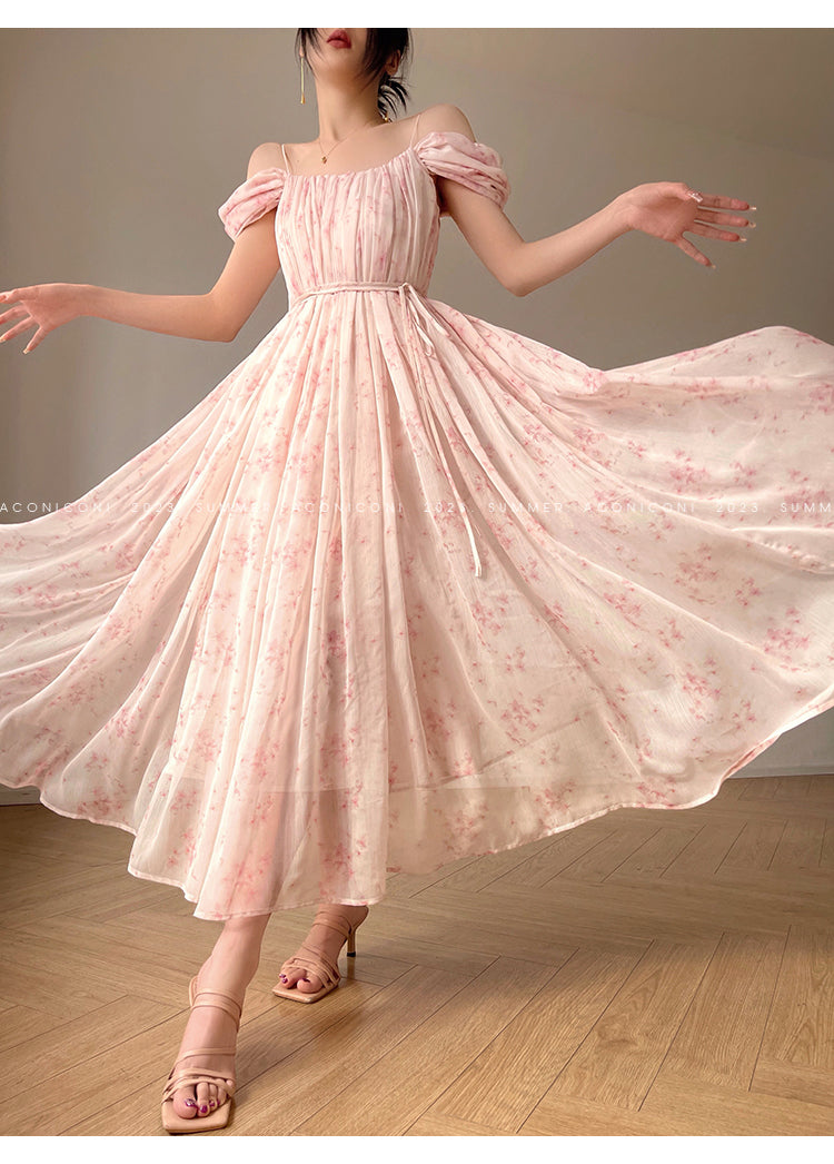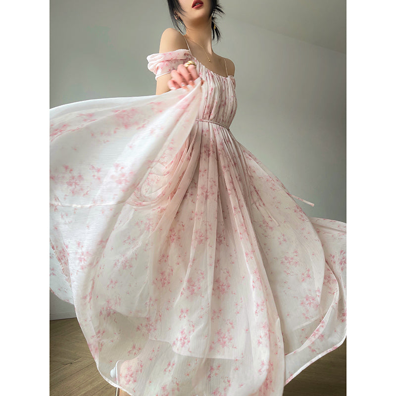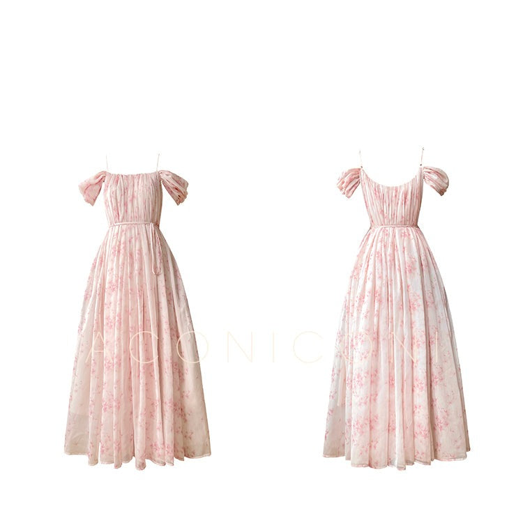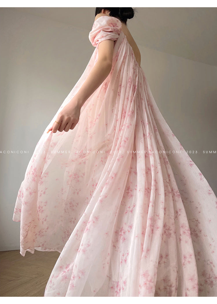 fabric is cool and breathable, has good perspiration function. This breathable fabric is comparable to natural silk, and is easy to care for, and its performance is better than natural silk. It is delicate and comfortable to wear, breathable with printed pink cherry blossoms in full bloom. It is gentle and romantic suspender design, very thin shoulder straps, exquisite and elegant. Adjustable shoulder straps, and adjustable sleeves, which are naturally stacked, presenting a natural draping sleeve shape to cover arm, and a naturally tailored curved neckline. The skirt is light, elegant and natural. The side seams are zippered for easy on and off. The inner lining is made of 160D chiffon fabric, which is light and breathable.