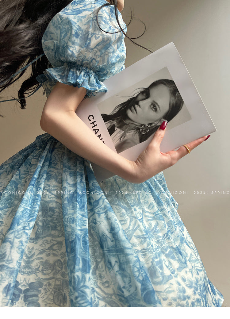 Aconiconi Elegant Blue French Print Short Princess Dress- Blue Ocean Whisper