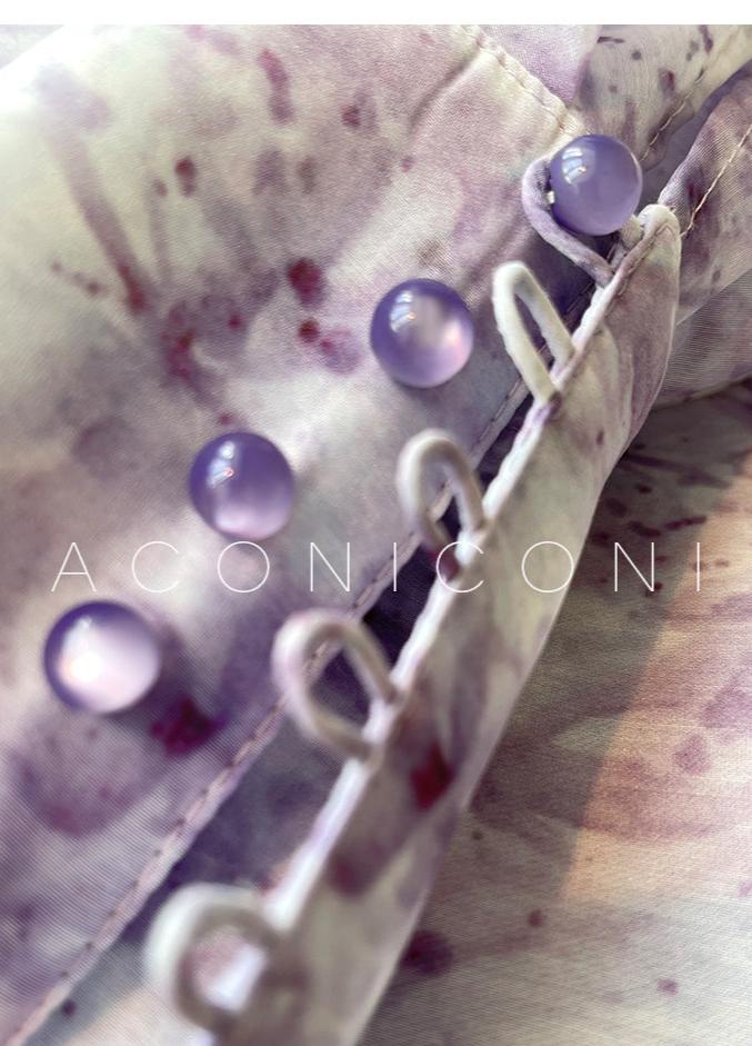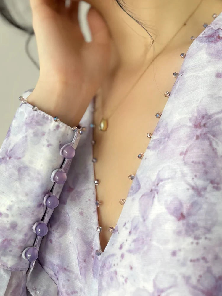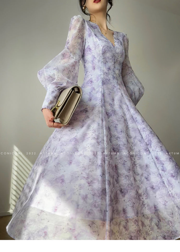 Aconiconi Elegant V-Neck Long Sleeve High Waist Swing tea Dress- Cloud soaked Wisteria