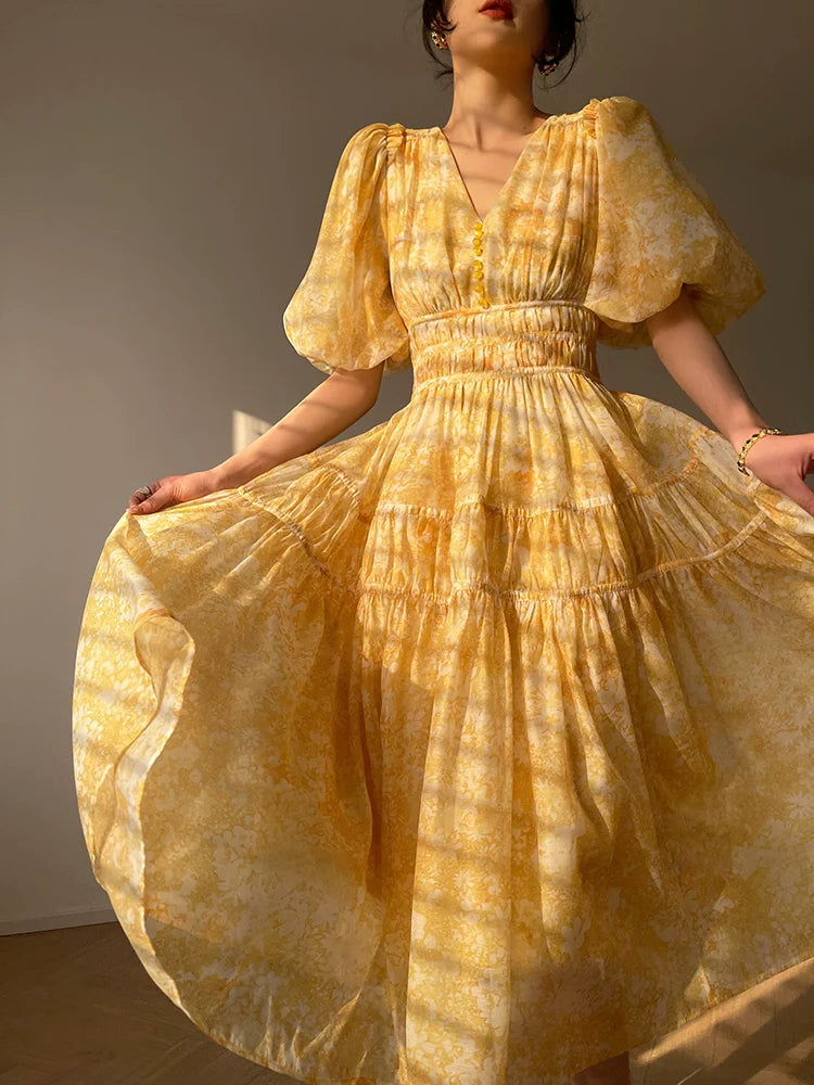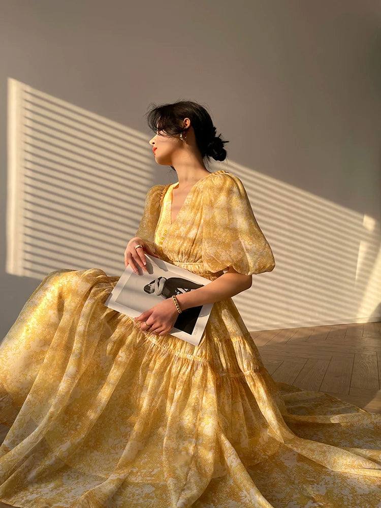 Aconiconi Elegant Yellow V-NeckPuff Sleeve Vacation Dress- Manshan