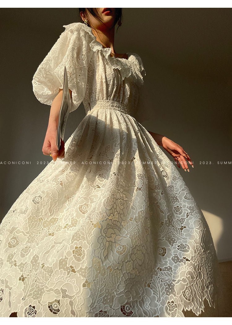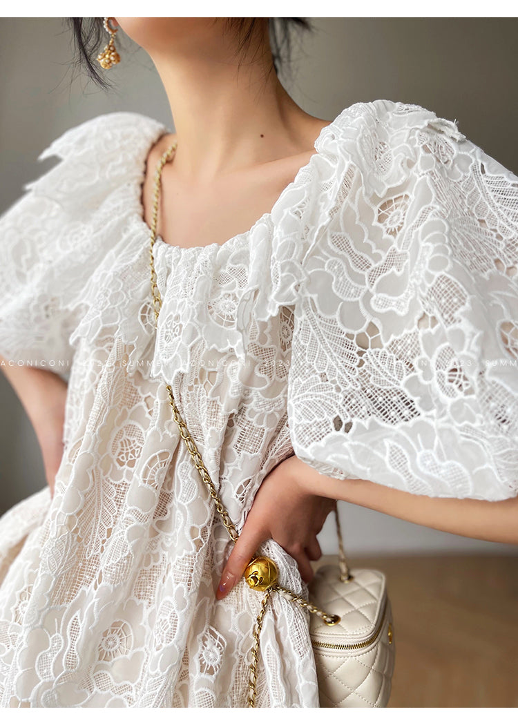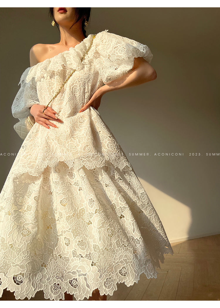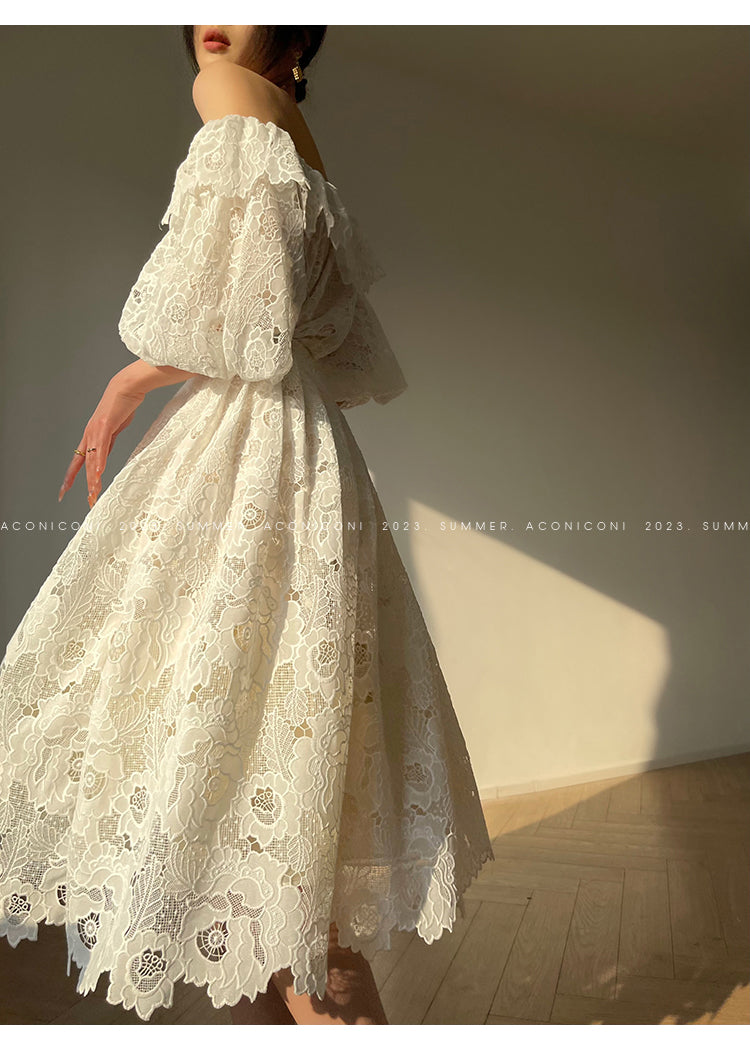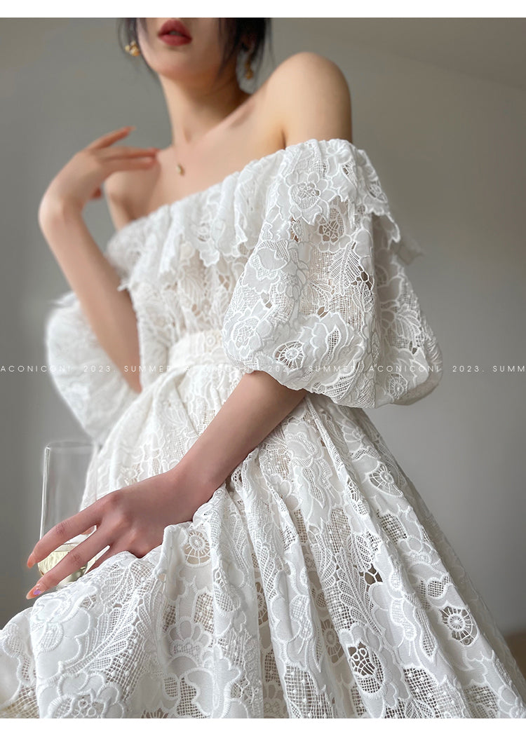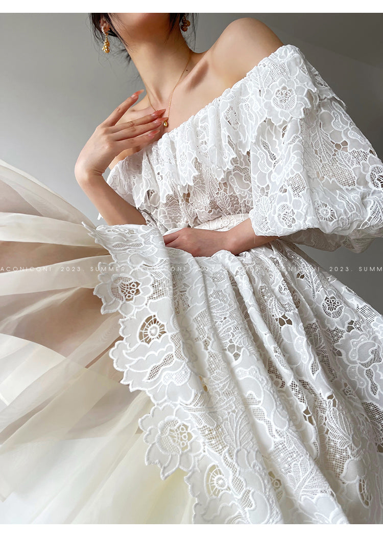 Popular elements/crafts: Puff sleeves, invisible zipper, off-the-shoulder hook flower hollow lace