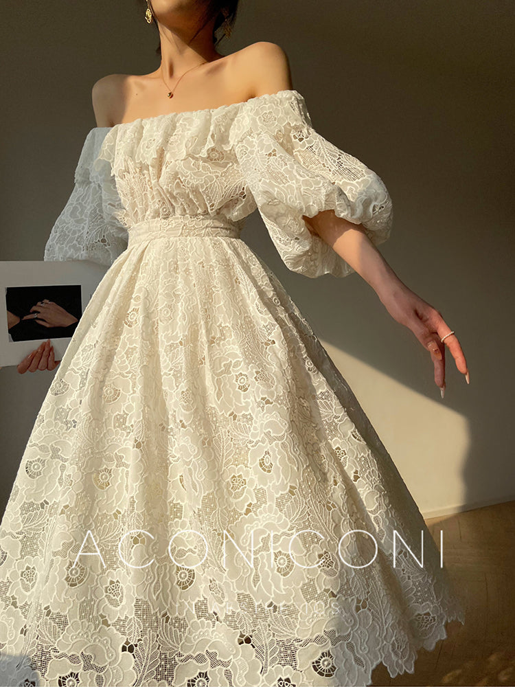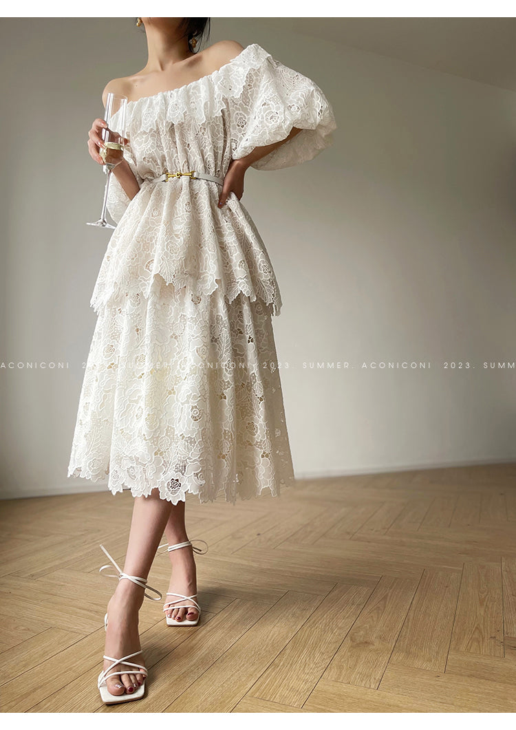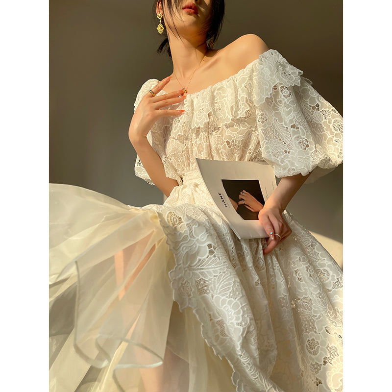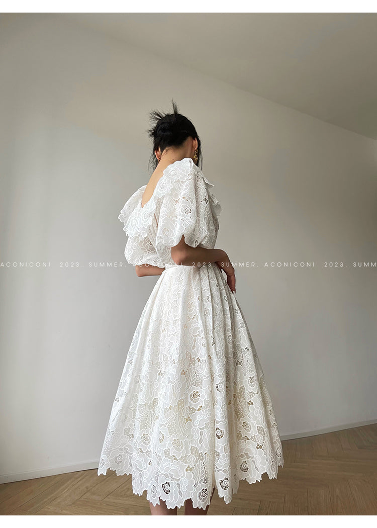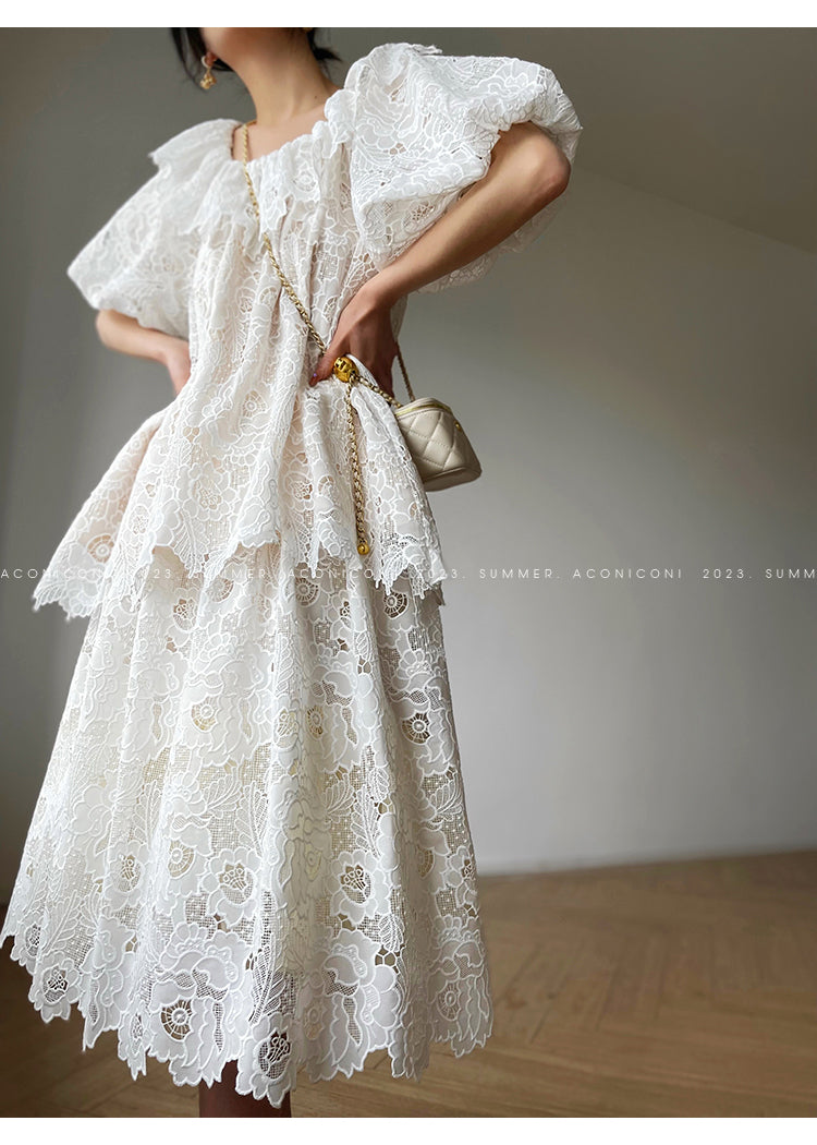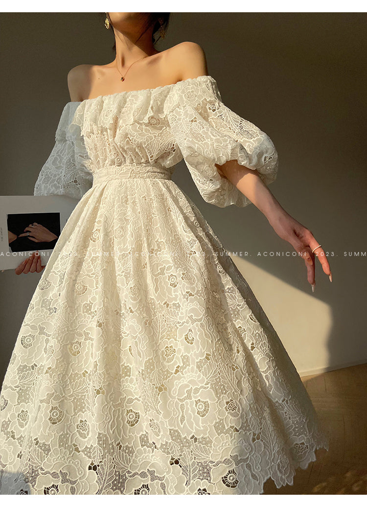 Popular elements/crafts: Puff sleeves, invisible zipper, off-the-shoulder hook flower hollow lace