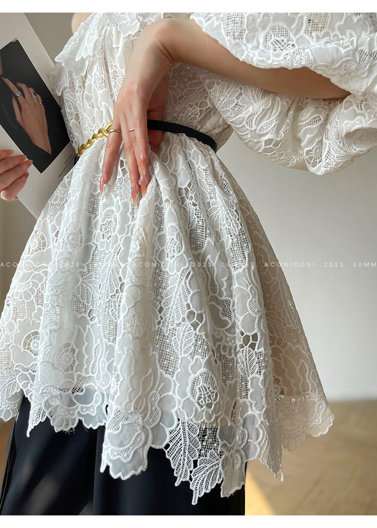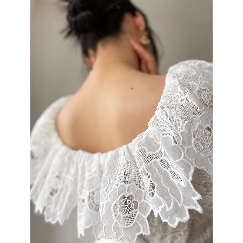 High-precision hollow embroidery lace. The whole fabric is made of imported machine-woven technology High-precision laser burnt flower embroidery technology Super heavy-duty fabric, it has a ruffled neckline ruffle design The begonia flower naturally hangs down and the lace is natural and flexible. The versatile. They can be worn with a round neck or off-shoulder.
