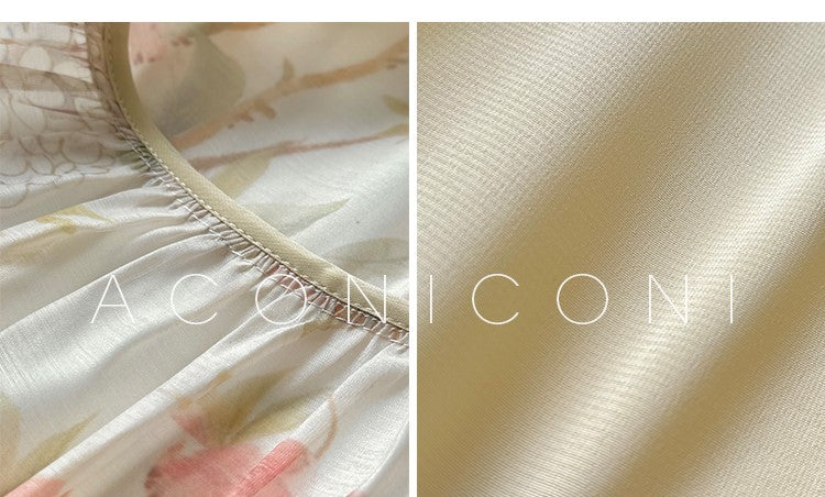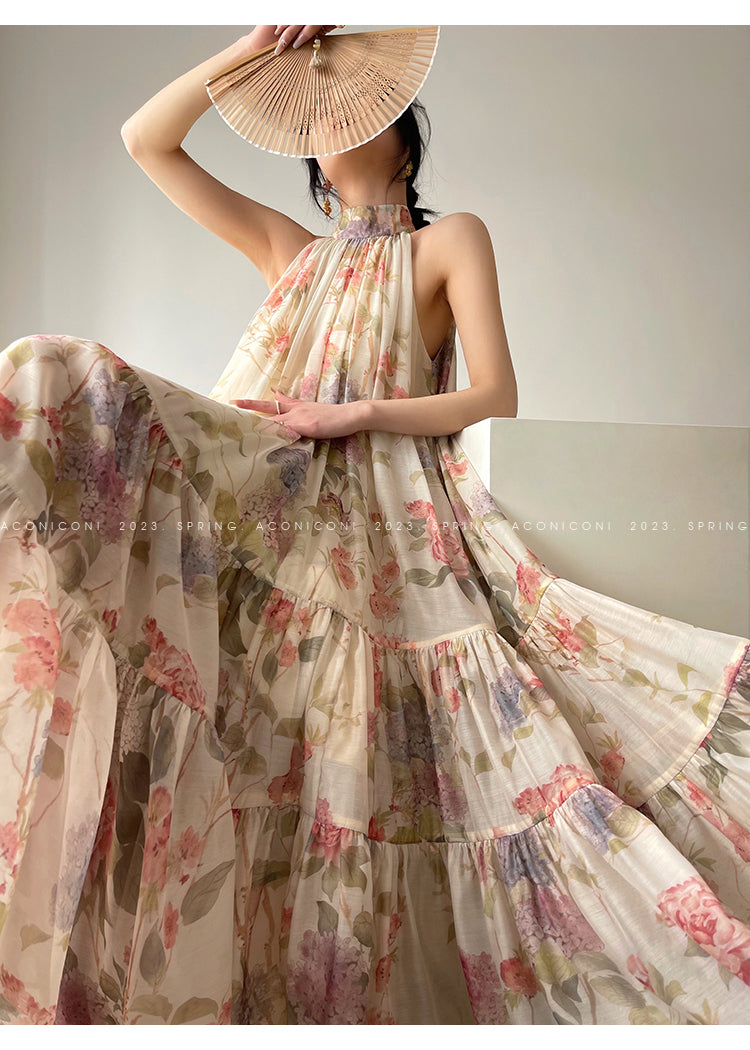 Aconiconi High End Floral Print Sleeve Less Halter Neck Long Resort Dress- Spring Dream