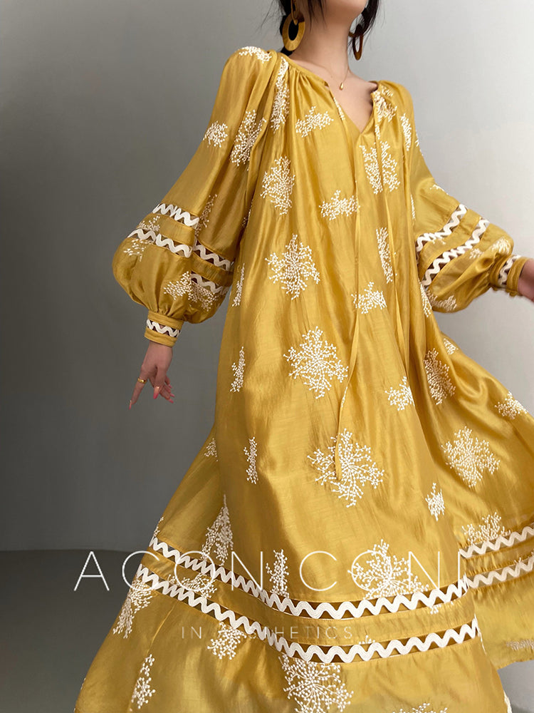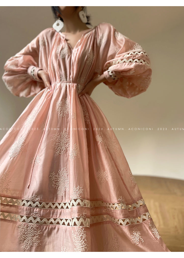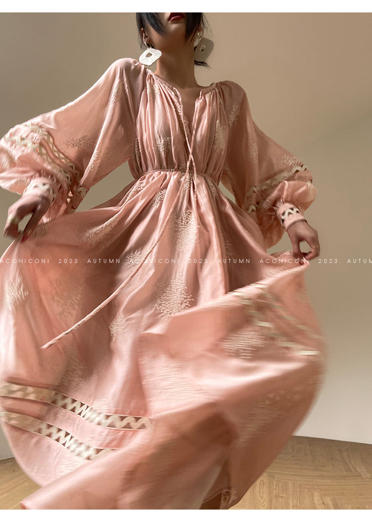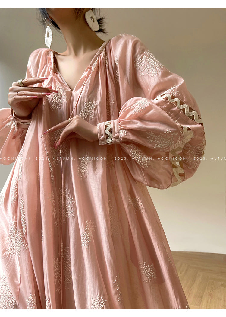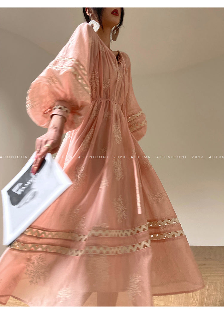 Aconiconi Light French Loose Slouchy Lace Balloon Sleeve Dress - Sunset