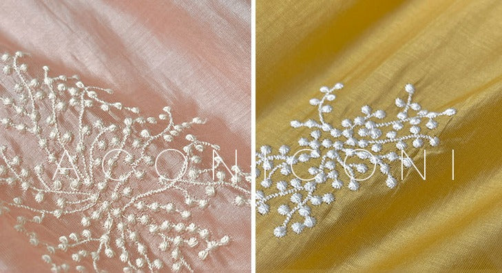 80% Tencel 20% Nylon Fabric is tight and shiny. Soft and silky Tencel fabric for comfortable, breathable and skin-friendly summer wear. Imported woven embroidery thread technology. Heavy-duty design fabric. Pink and orange two-color beige embroidery thread contrasting color design. Stylish, exquisite and simple round neck gives people a relaxed feeling.