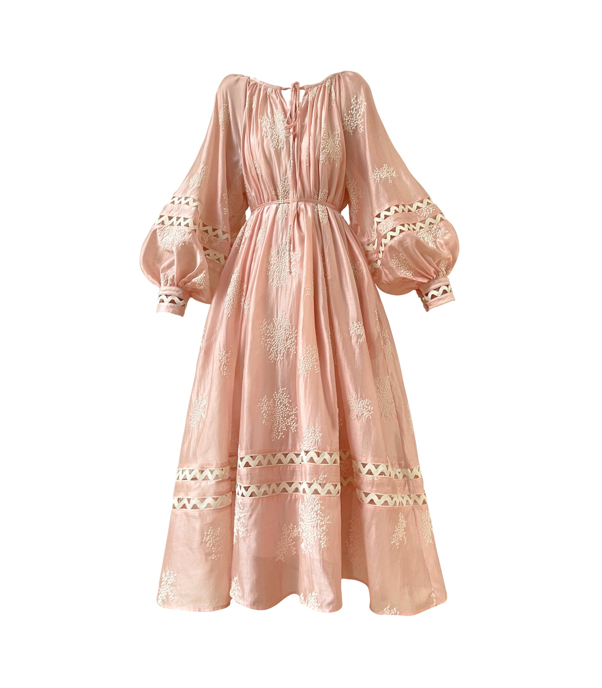 Crafted with an effortless blend of French elegance and modern style, the Aconiconi dress is sure to turn heads. Featuring a slouchy, loose silhouette, a full skirt, and stylish balloon sleeves, this lacy design exudes a soft femininity in a stunning Sunset hue. An elegant, free-flowing gown for the fashionista in search of a timelessly trendy look