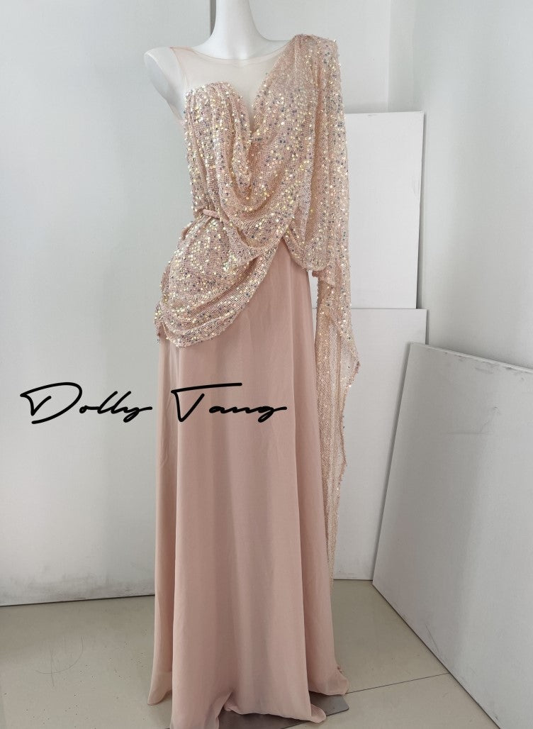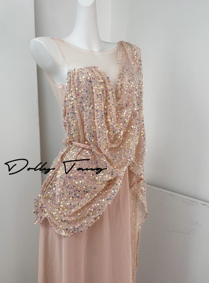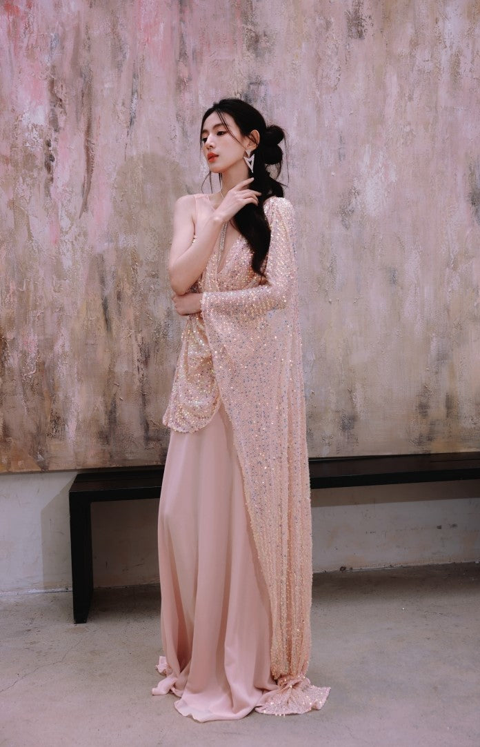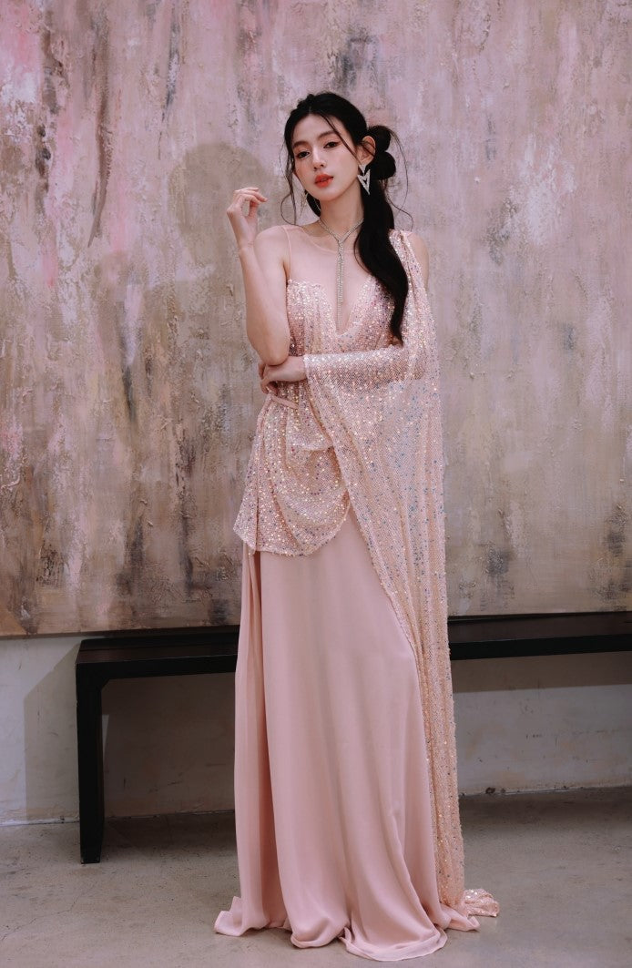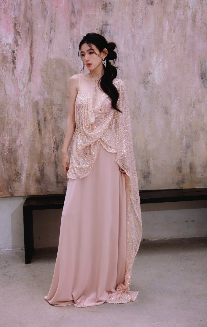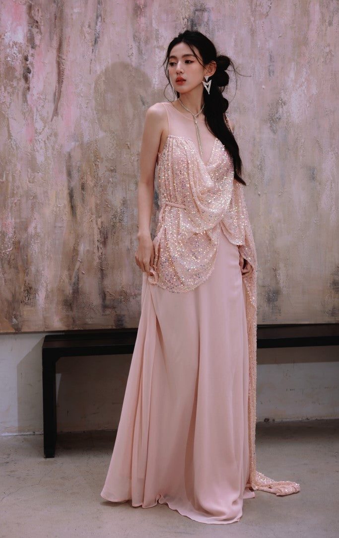 DOLLY Luxury Pink Greek Style Deep V-Neck Sleeveless draped Long Prom Dress-Ulaia