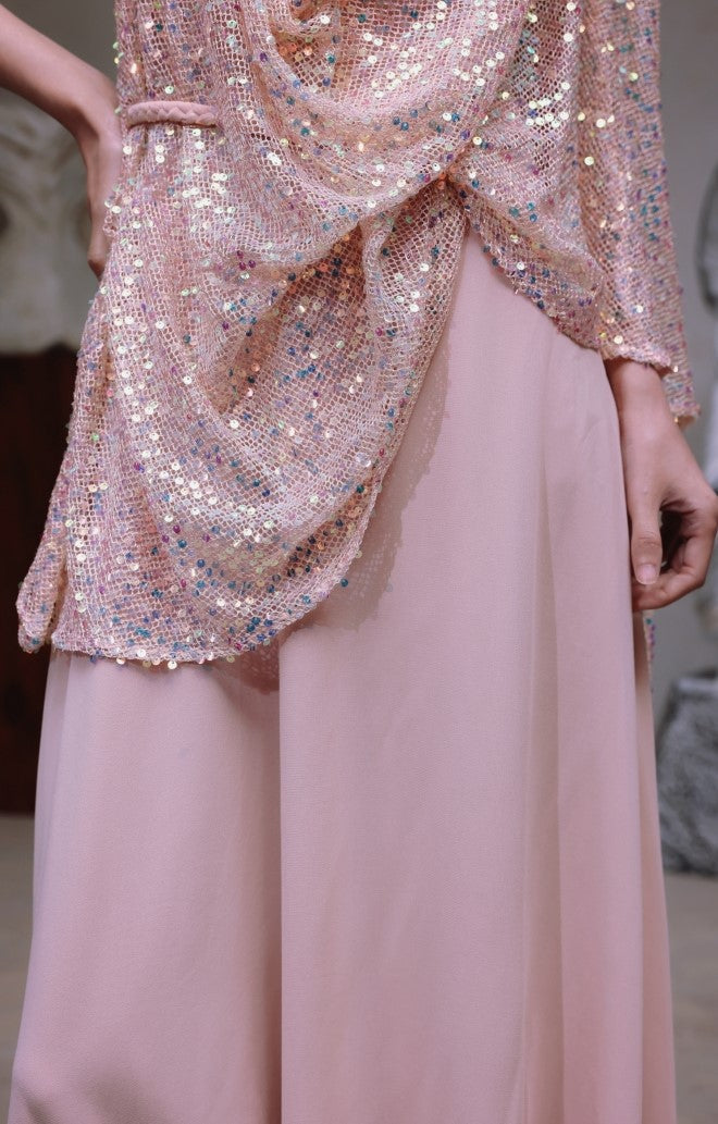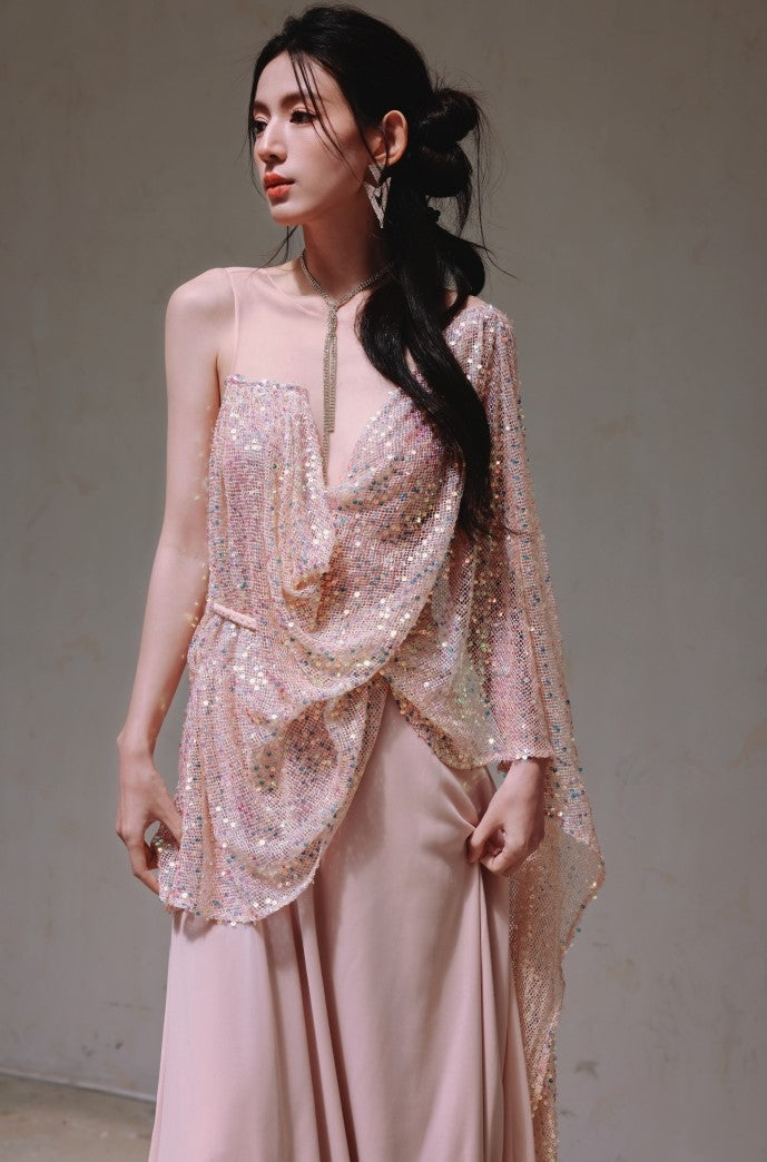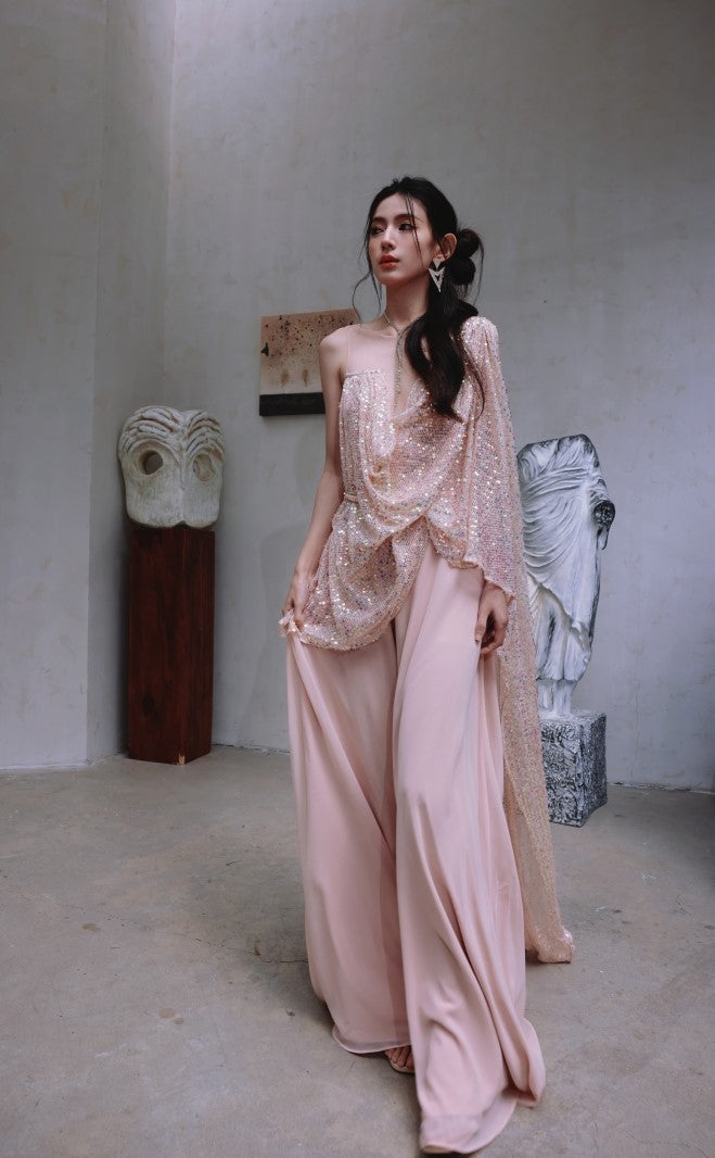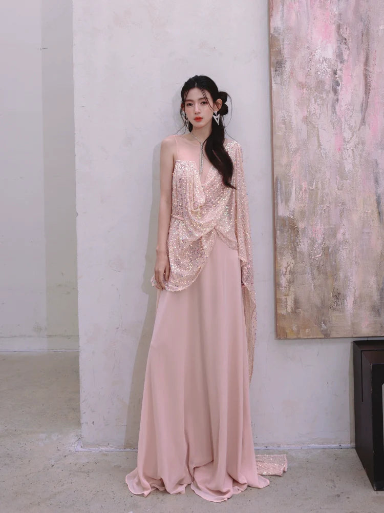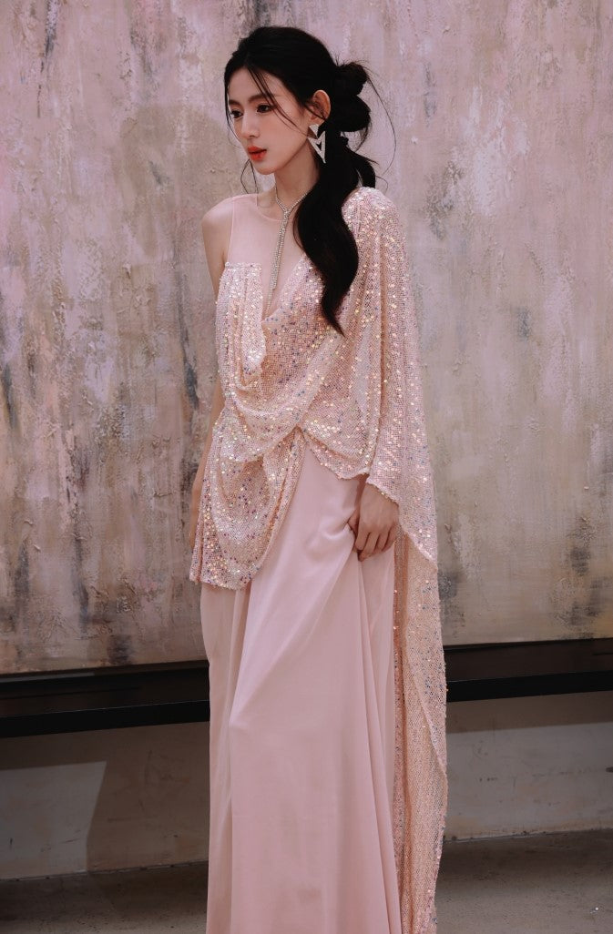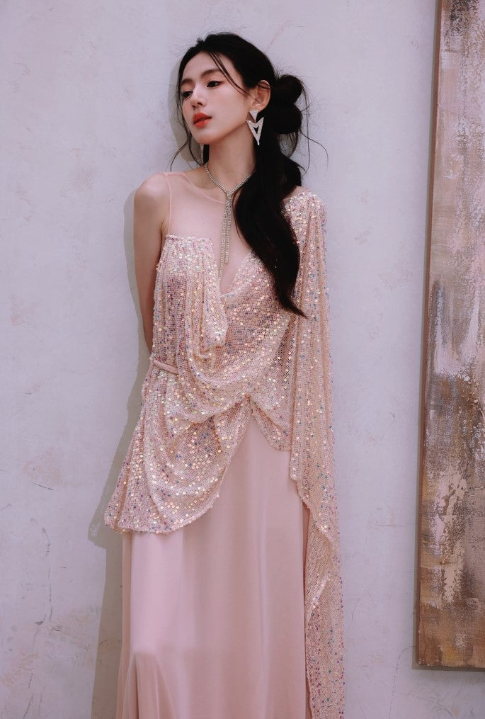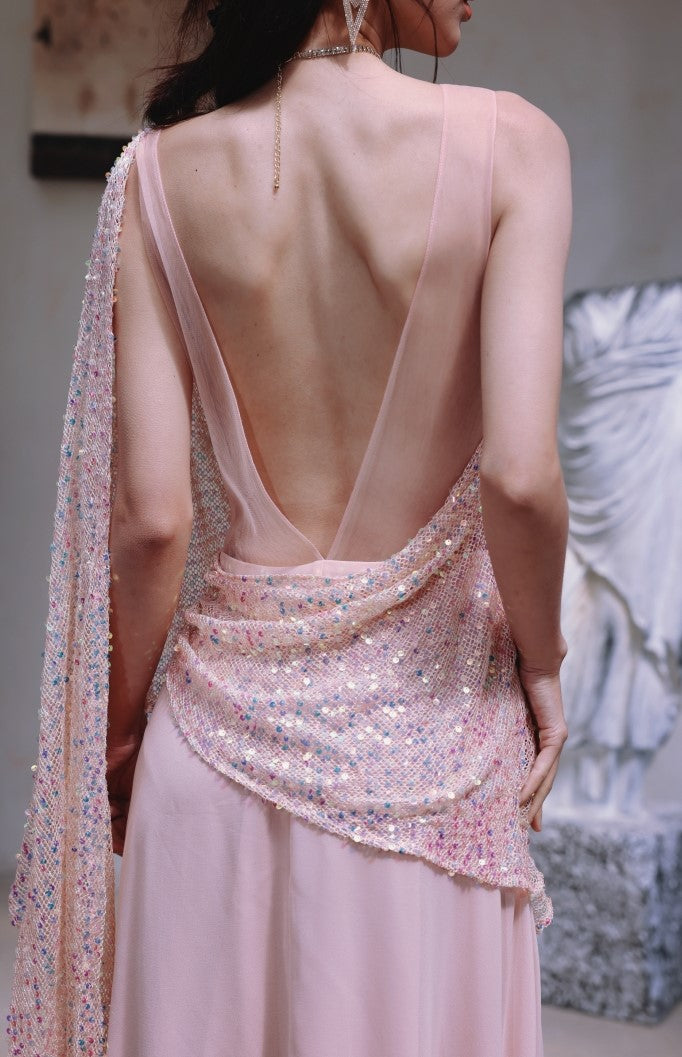 DOLLY Luxury Pink Greek Style Deep V-Neck Sleeveless draped Long Prom Dress-Ulaia
