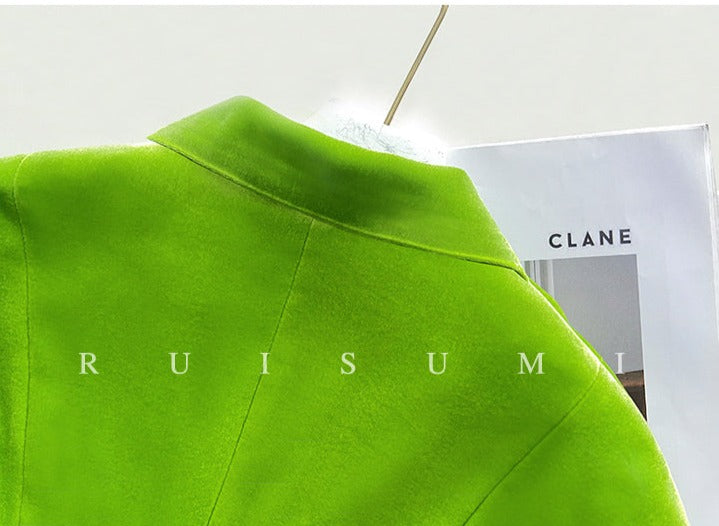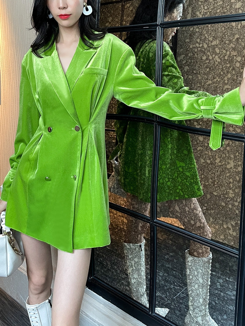 high-end bright green velvet suit waist pleate jacket dress - Doeai