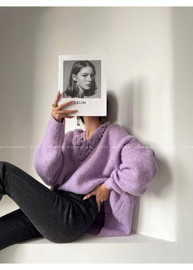 Aconiconi|Purple Flower Crochet openwork long cropped loose wool knit sweater dress - Twilight