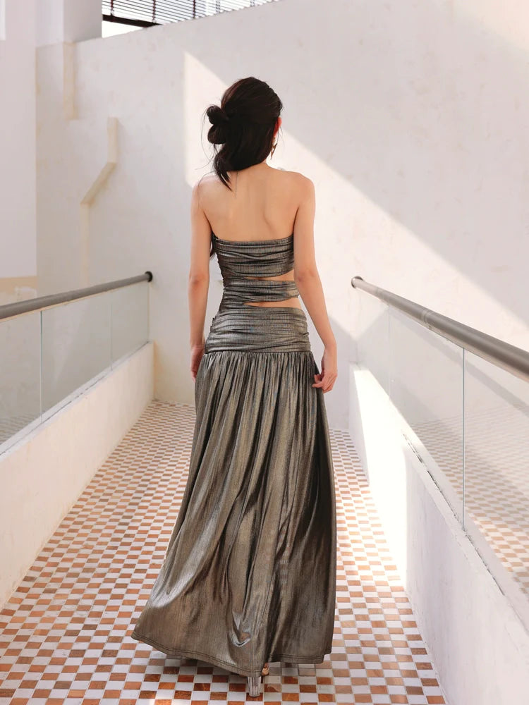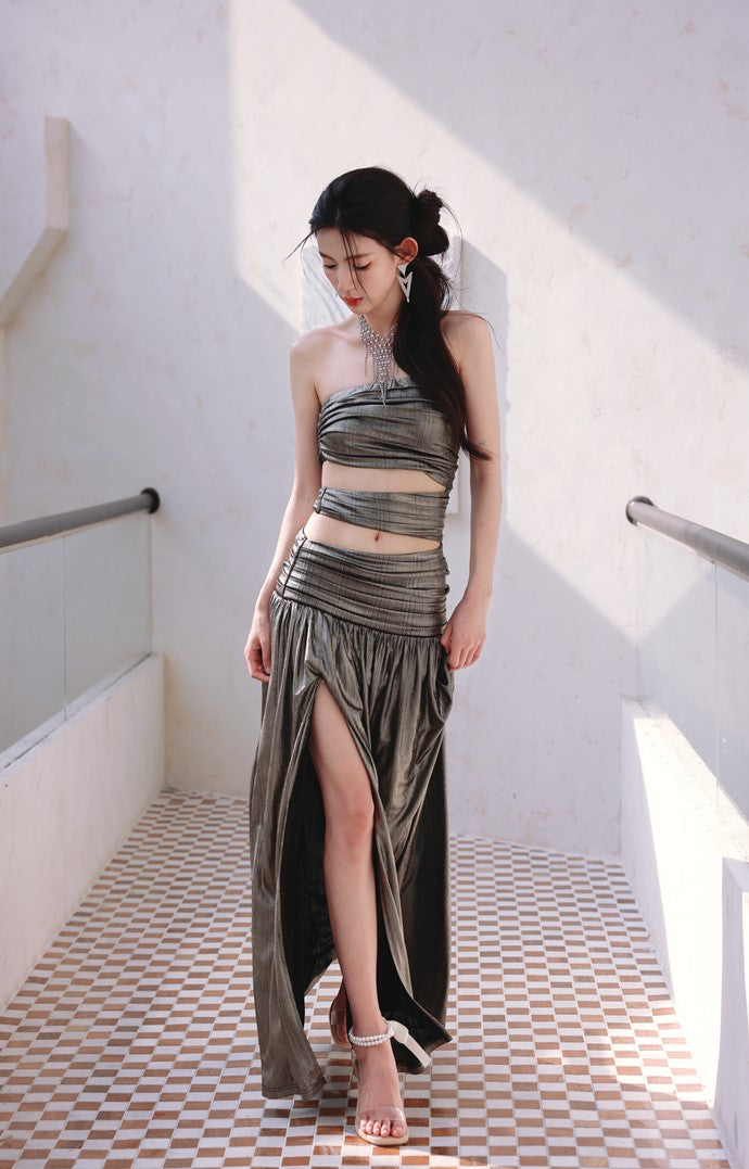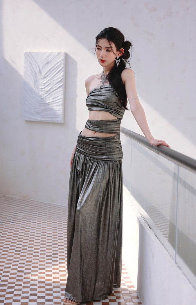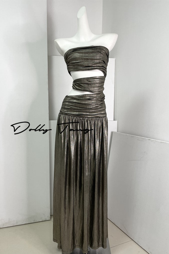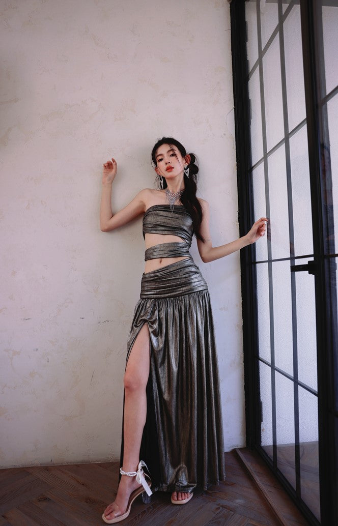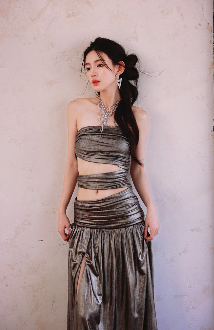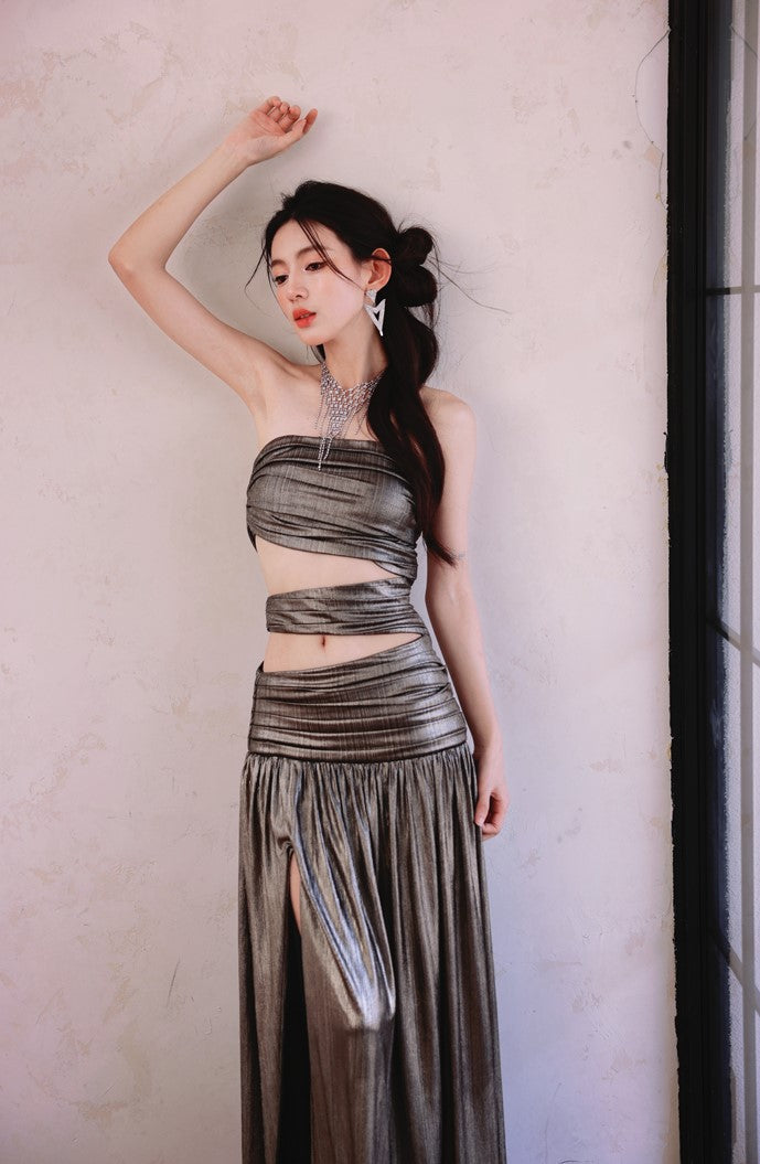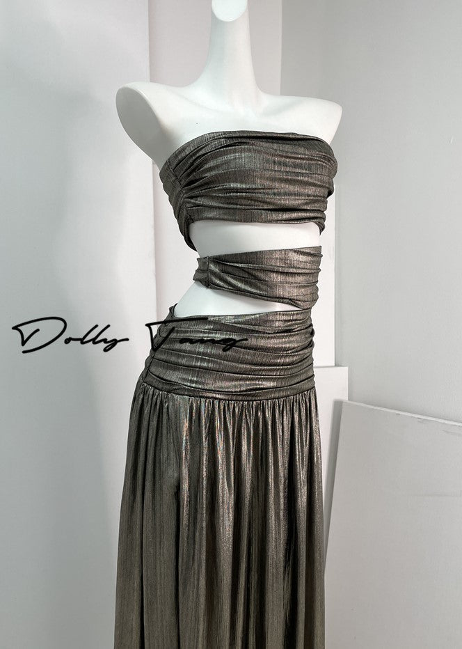 DOLLY Elegant Metallic Gray Skin Revealing Tube Top Long Dinner Dress-NIKITA
