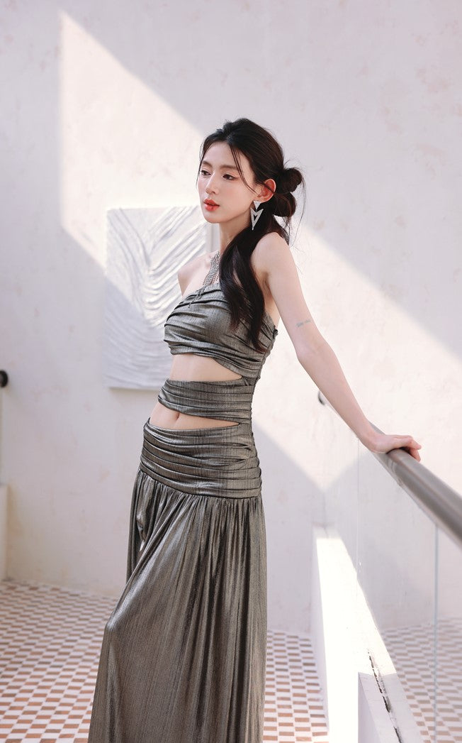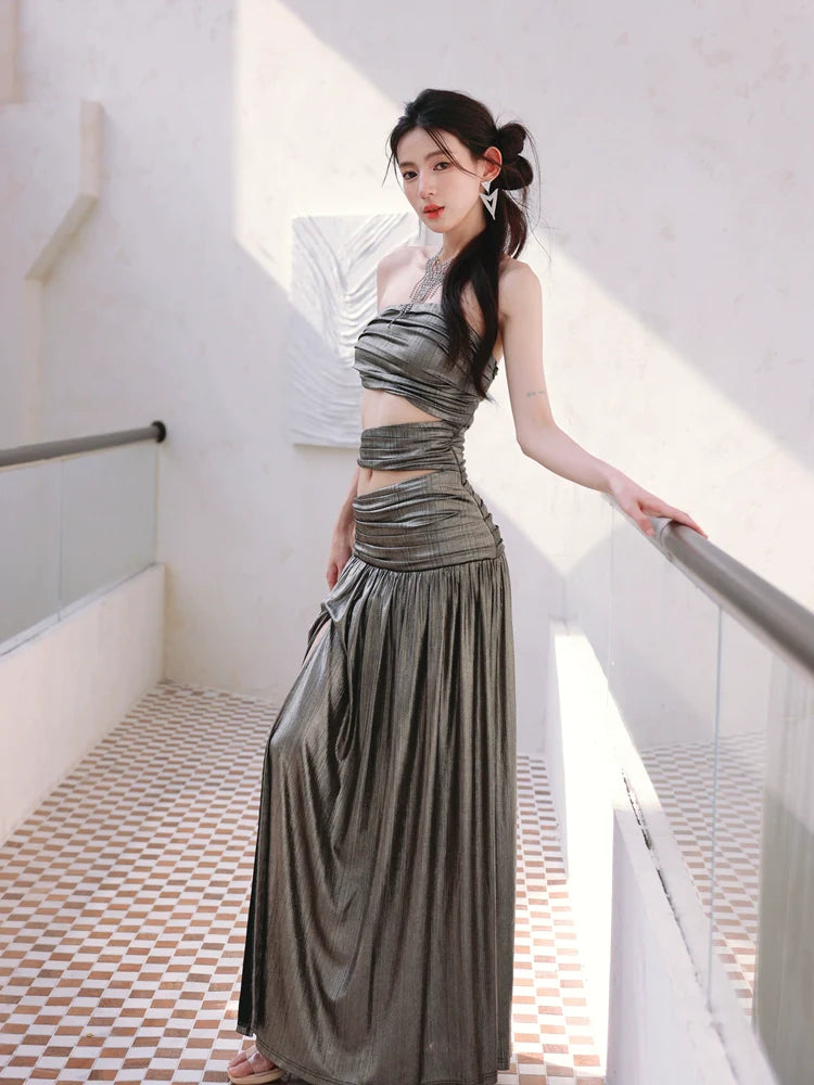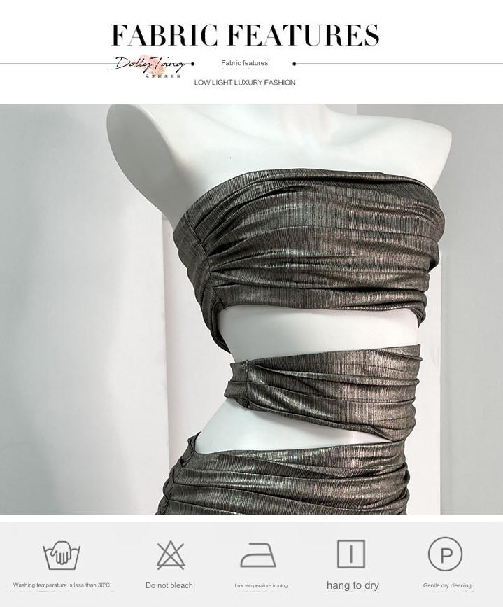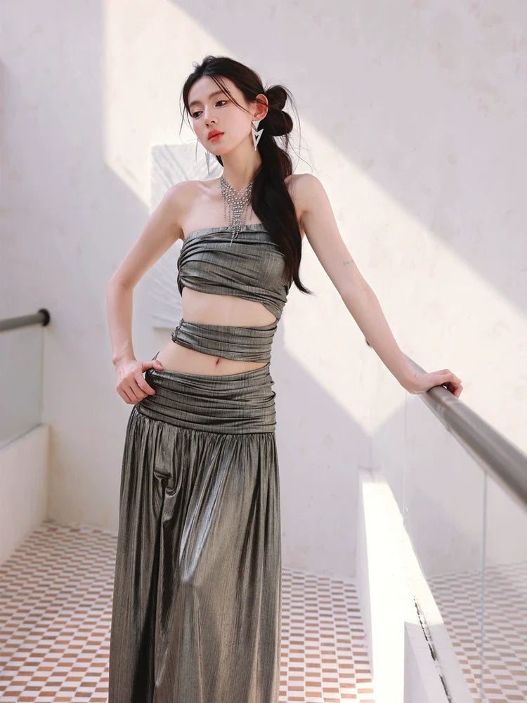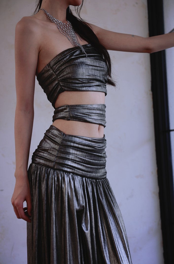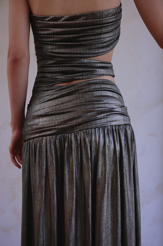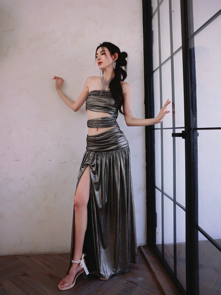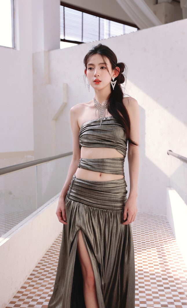 DOLLY Elegant Metallic Gray Skin Revealing Tube Top Long Dinner Dress-NIKITA