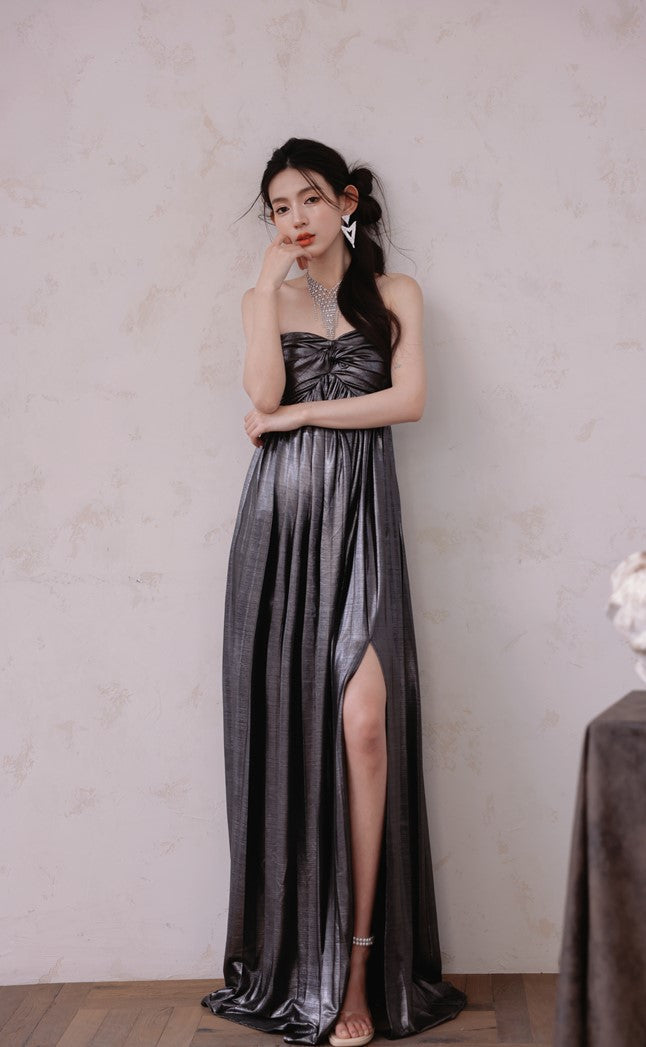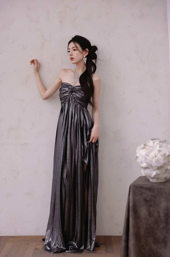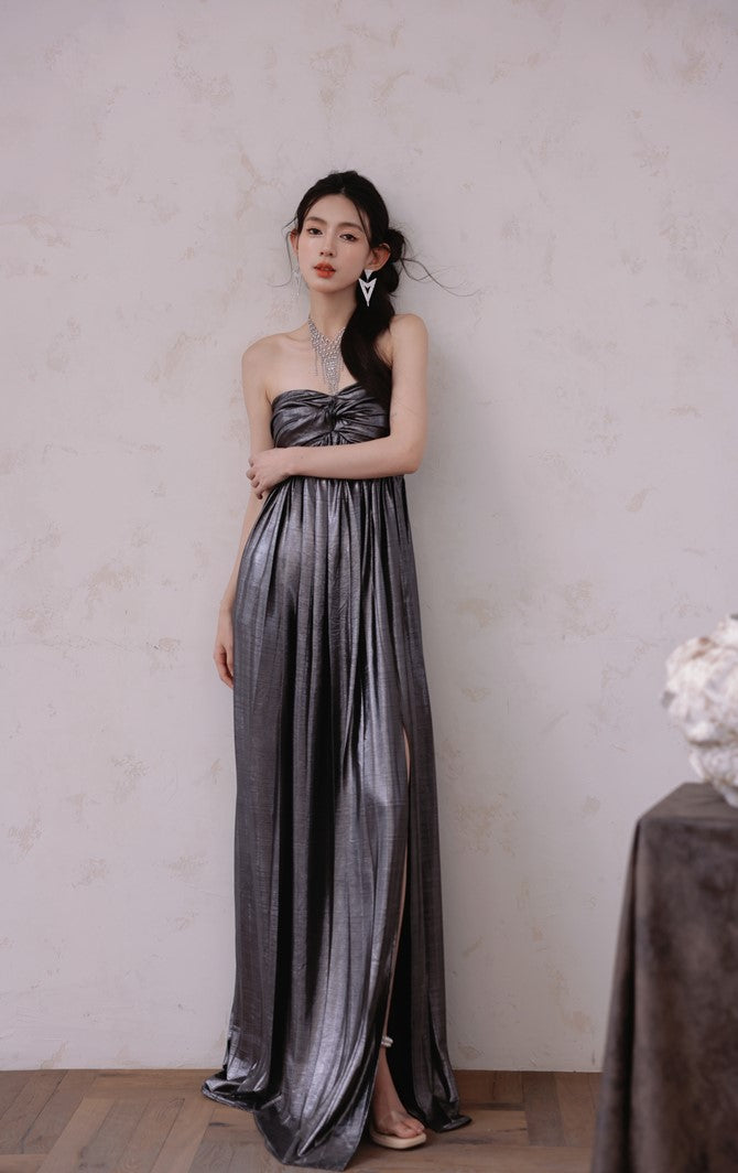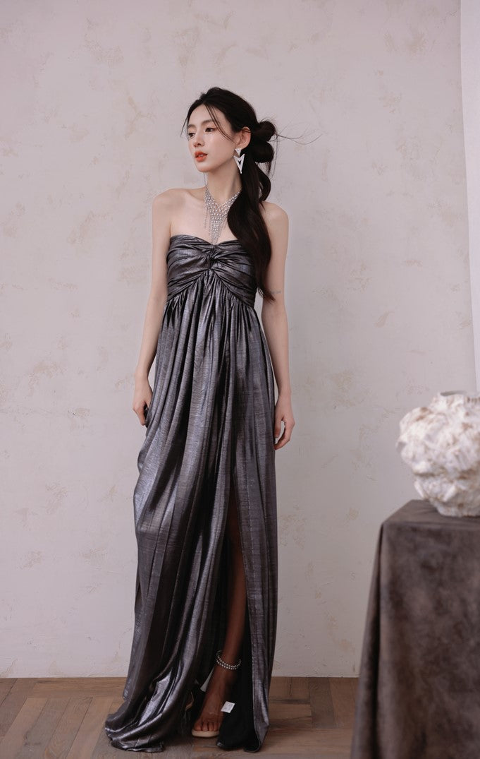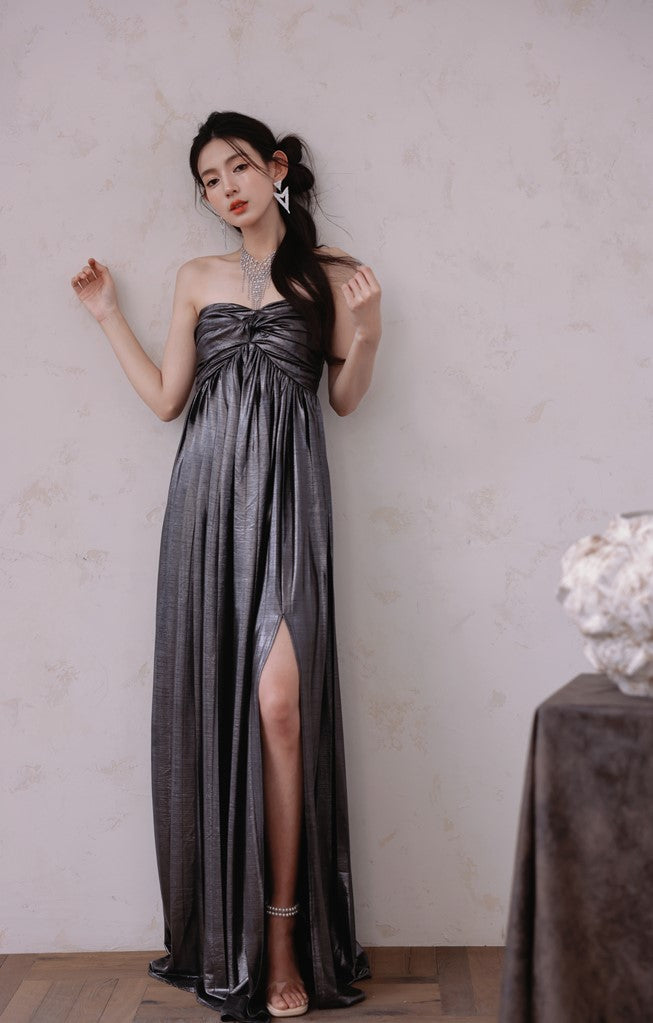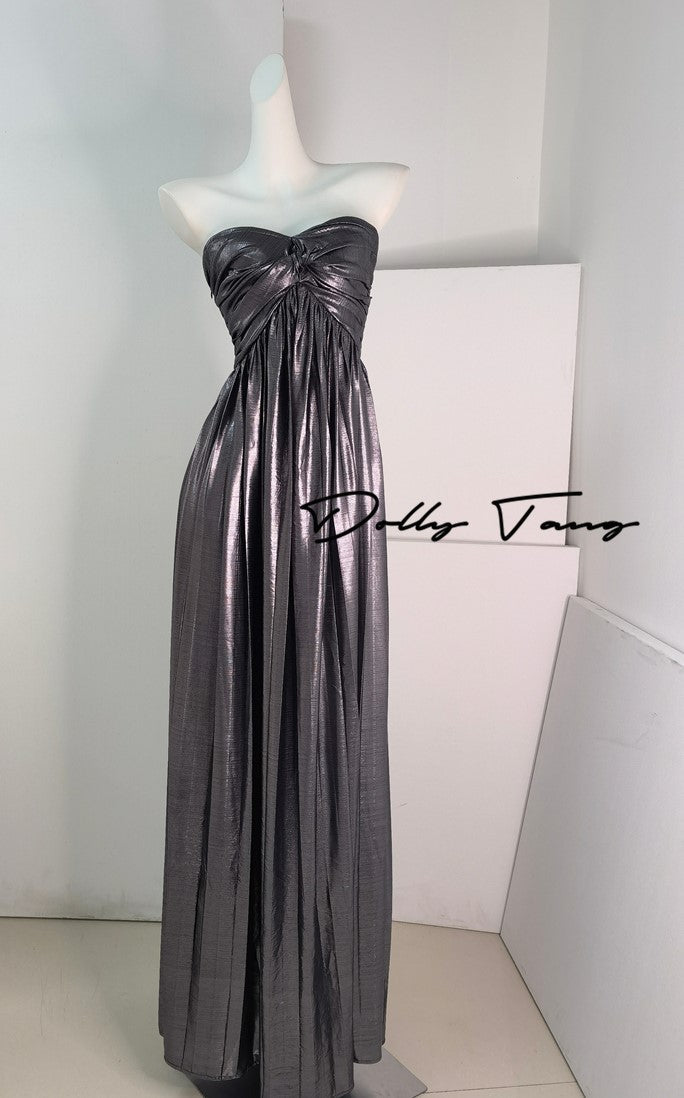 DOLLY Luxury Metallic Ash Pleated Tube Top Long Slit Dress-VIVA