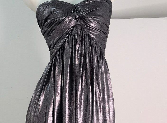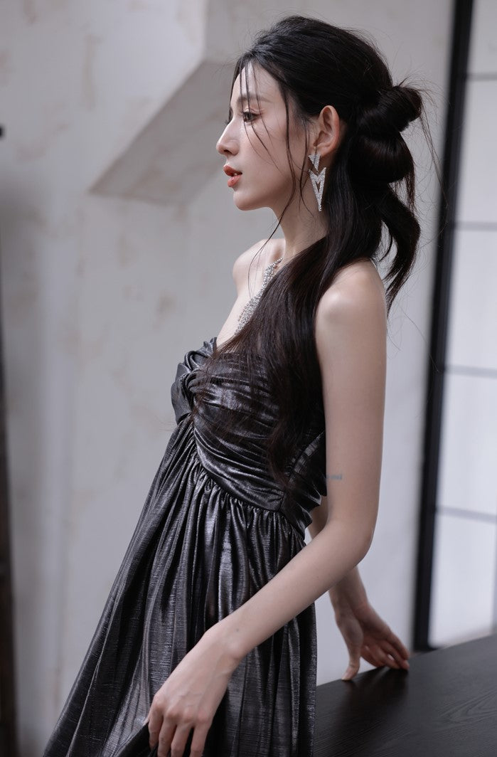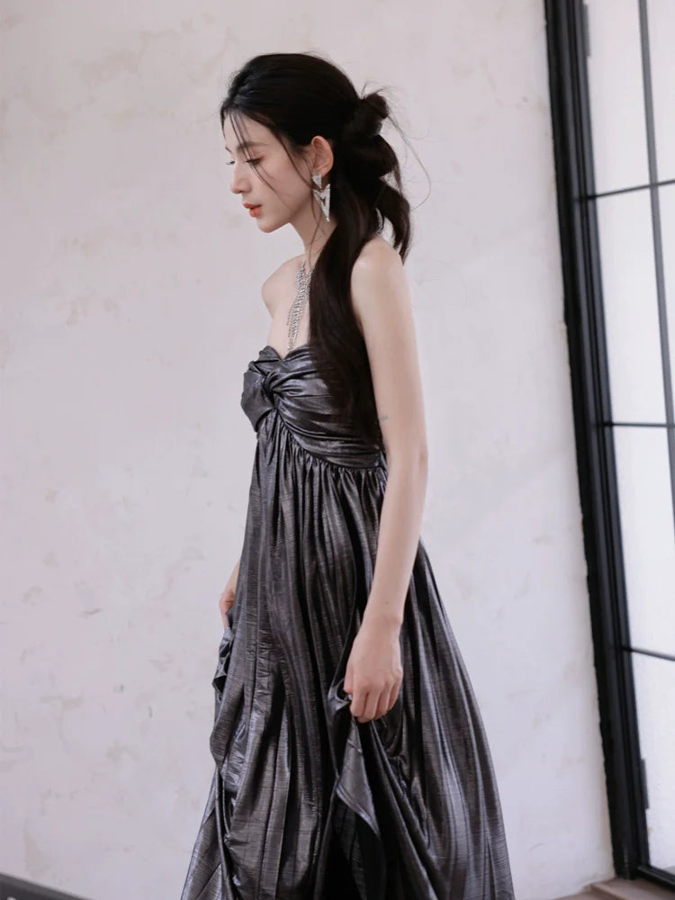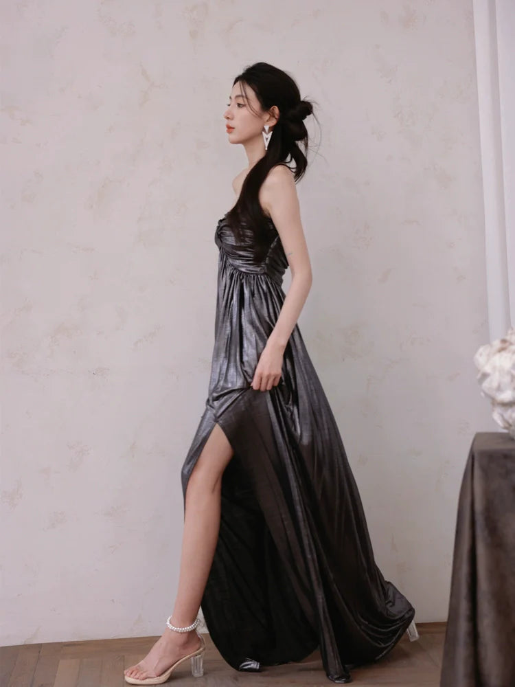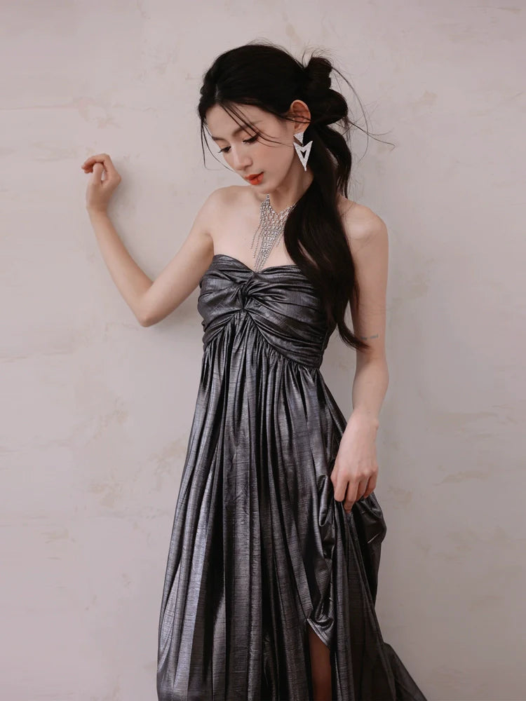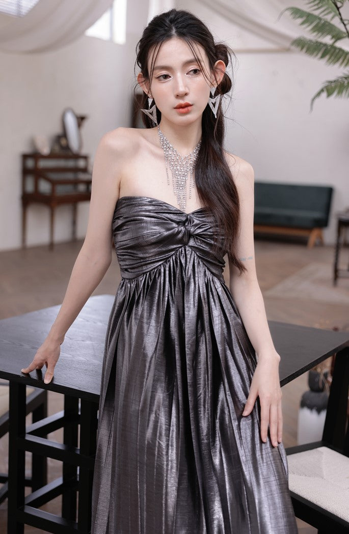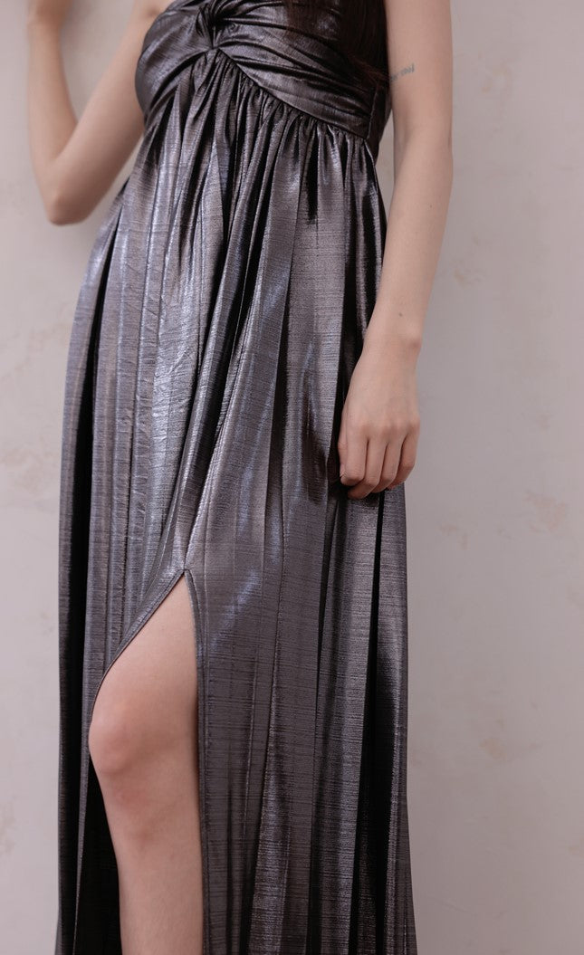 DOLLY Luxury Metallic Ash Pleated Tube Top Long Slit Dress-VIVA