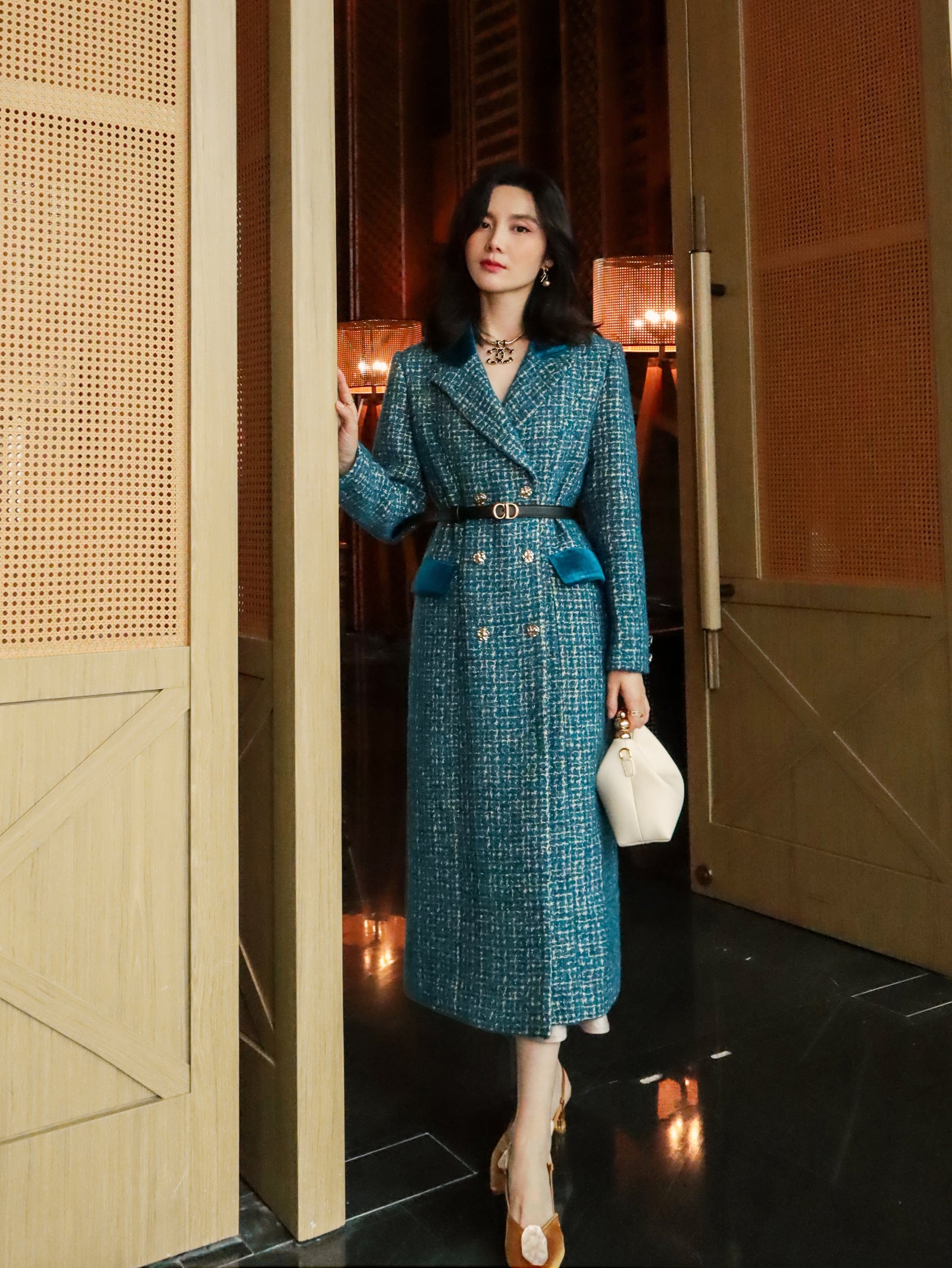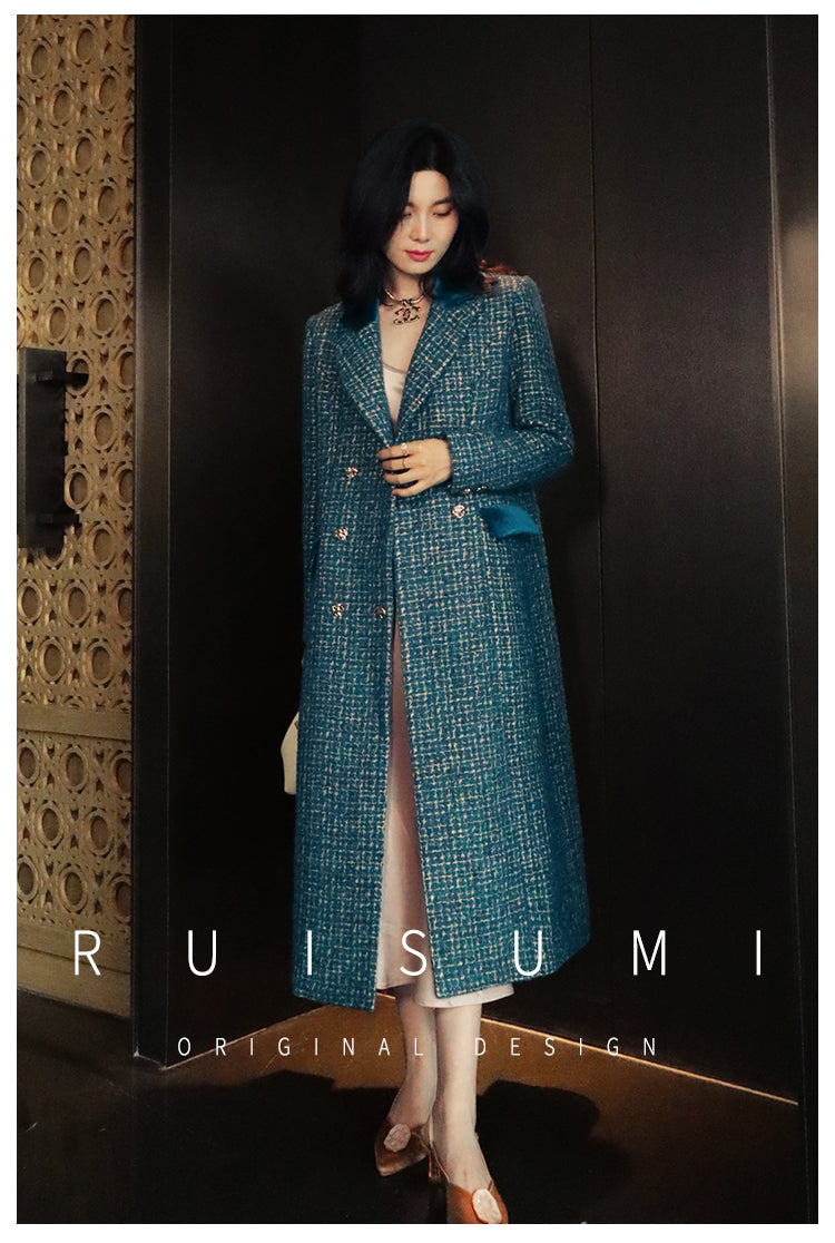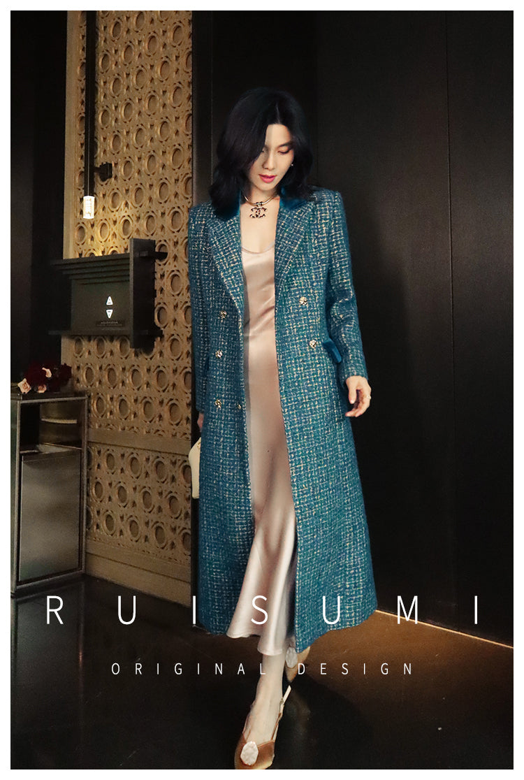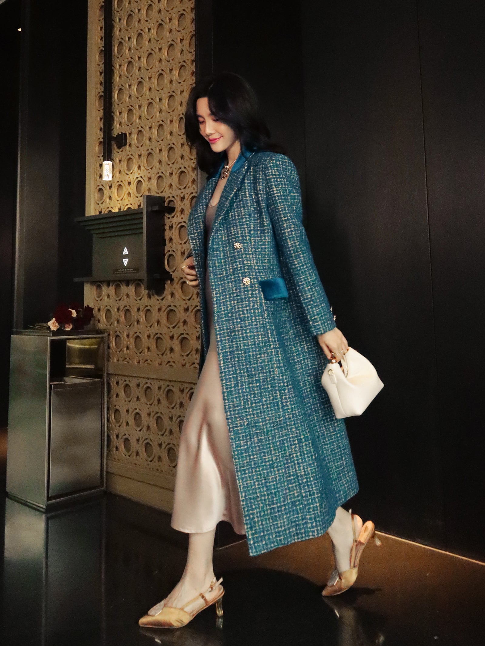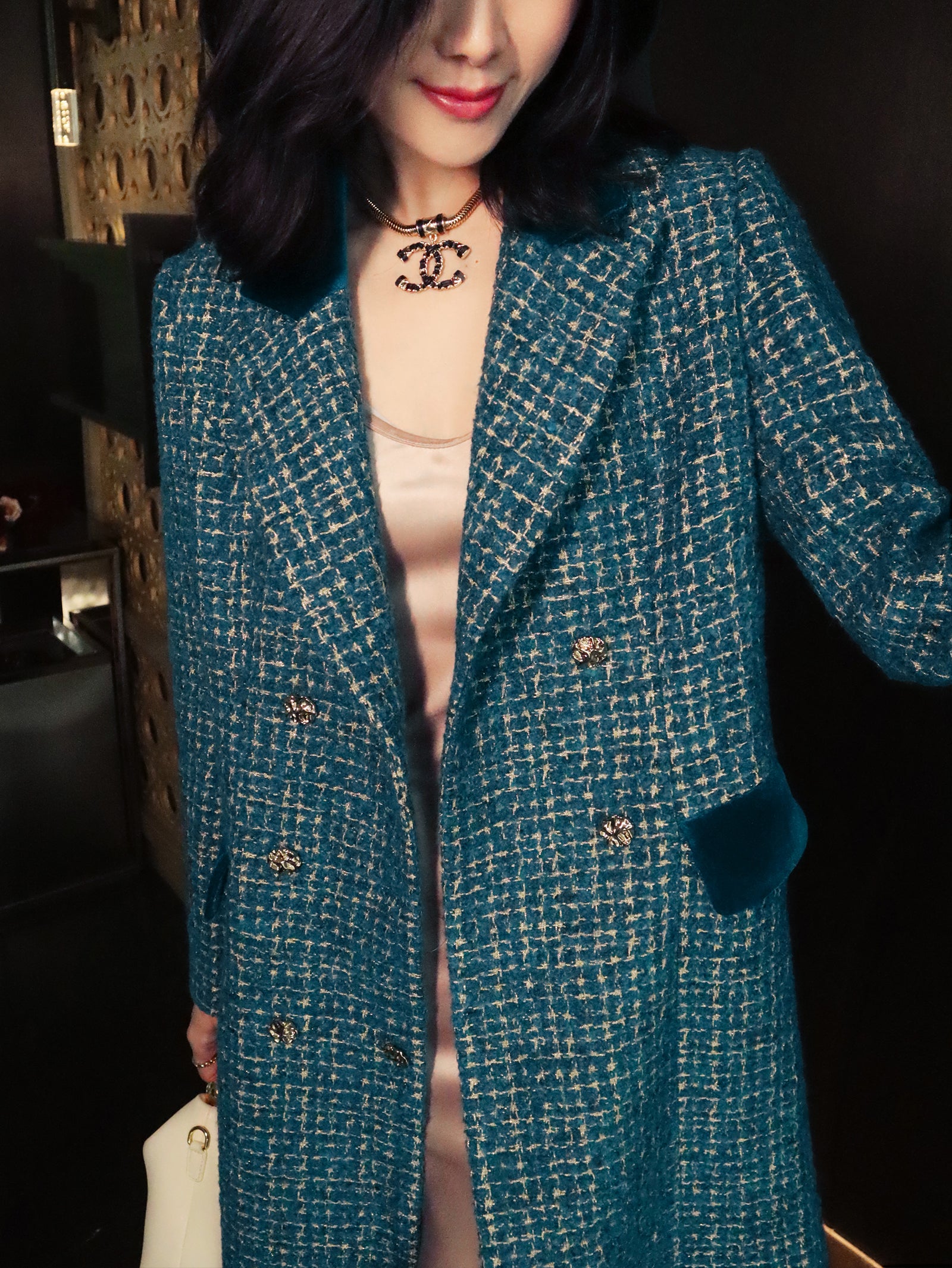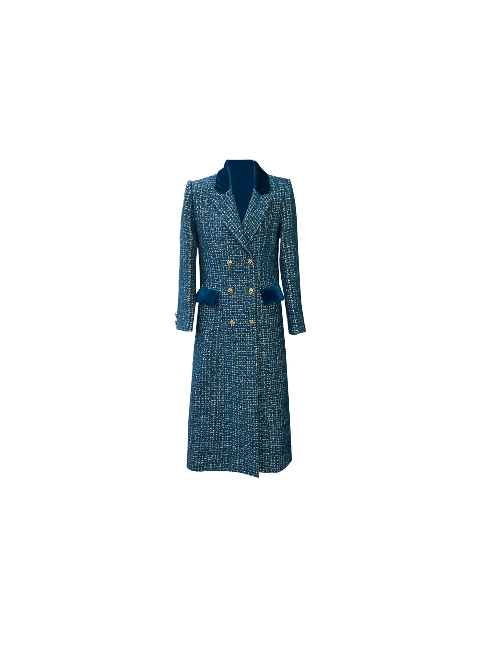 Lady's luxury high-end retro big peacock blue splicing bright silk design wool long coat- Jessy