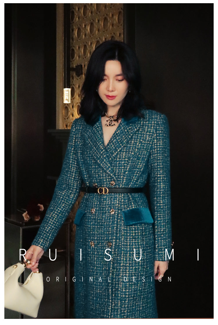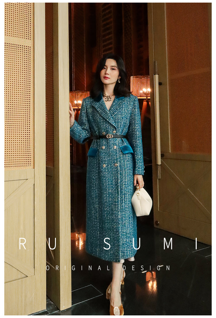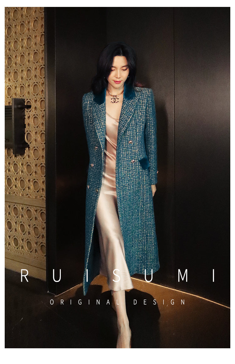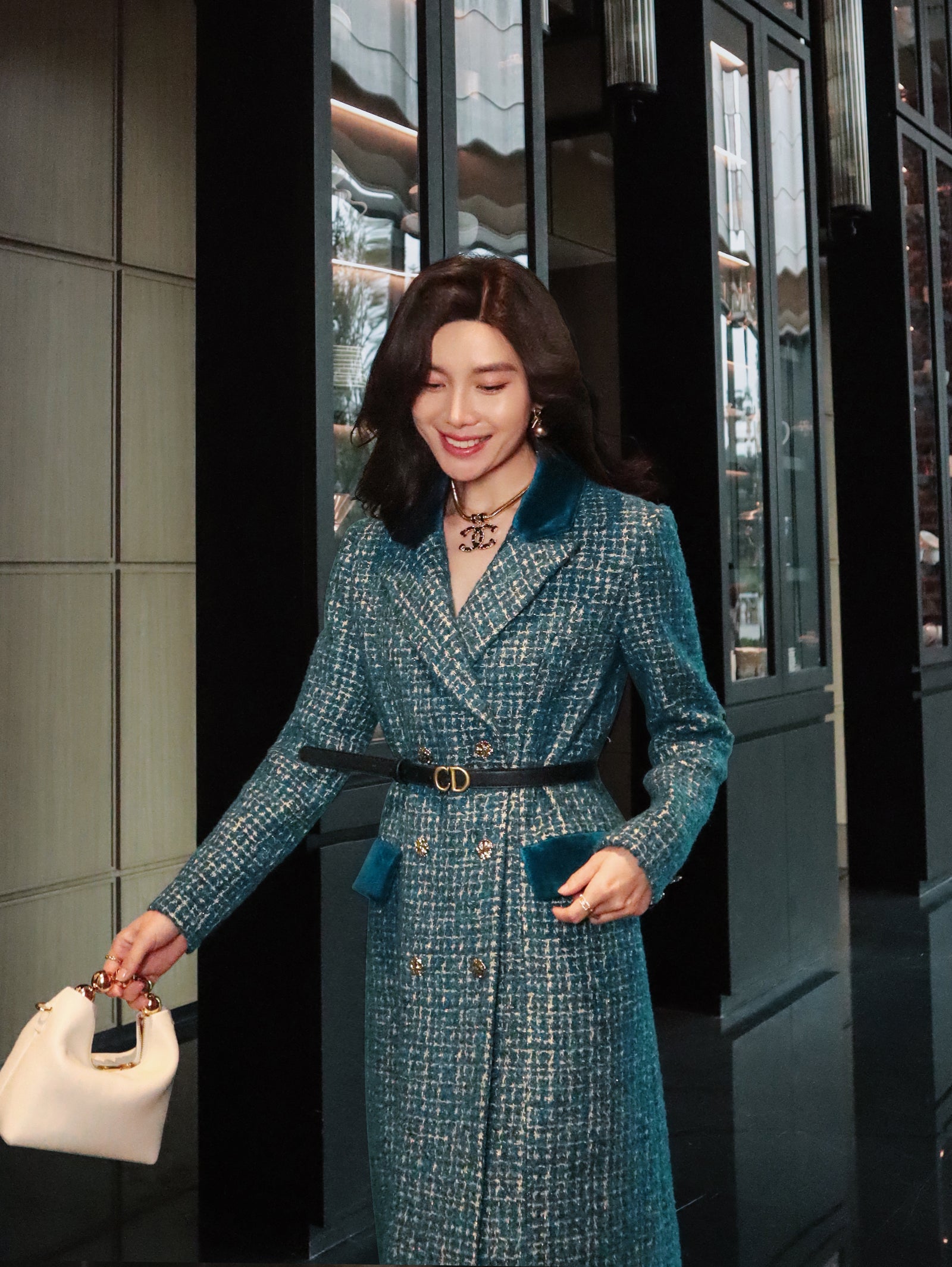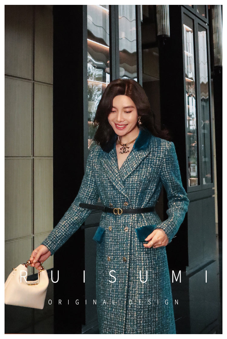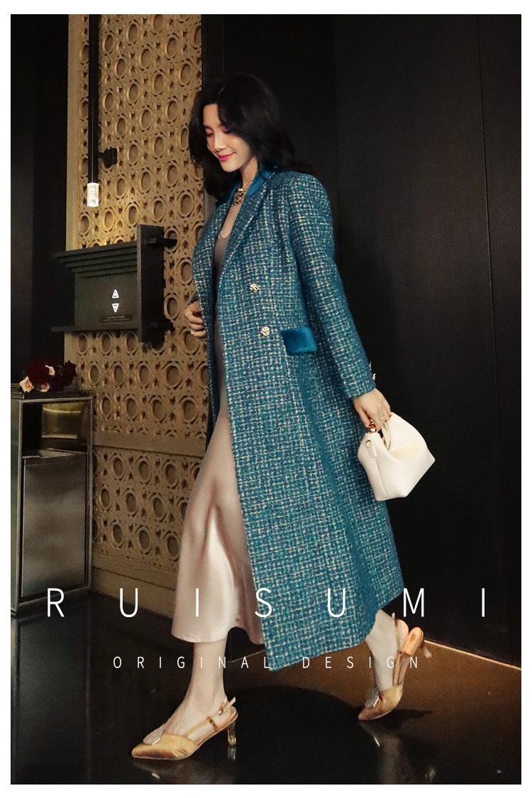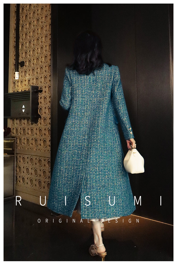 Lady's luxury high-end retro big peacock blue splicing bright silk design wool long coat- Jessy