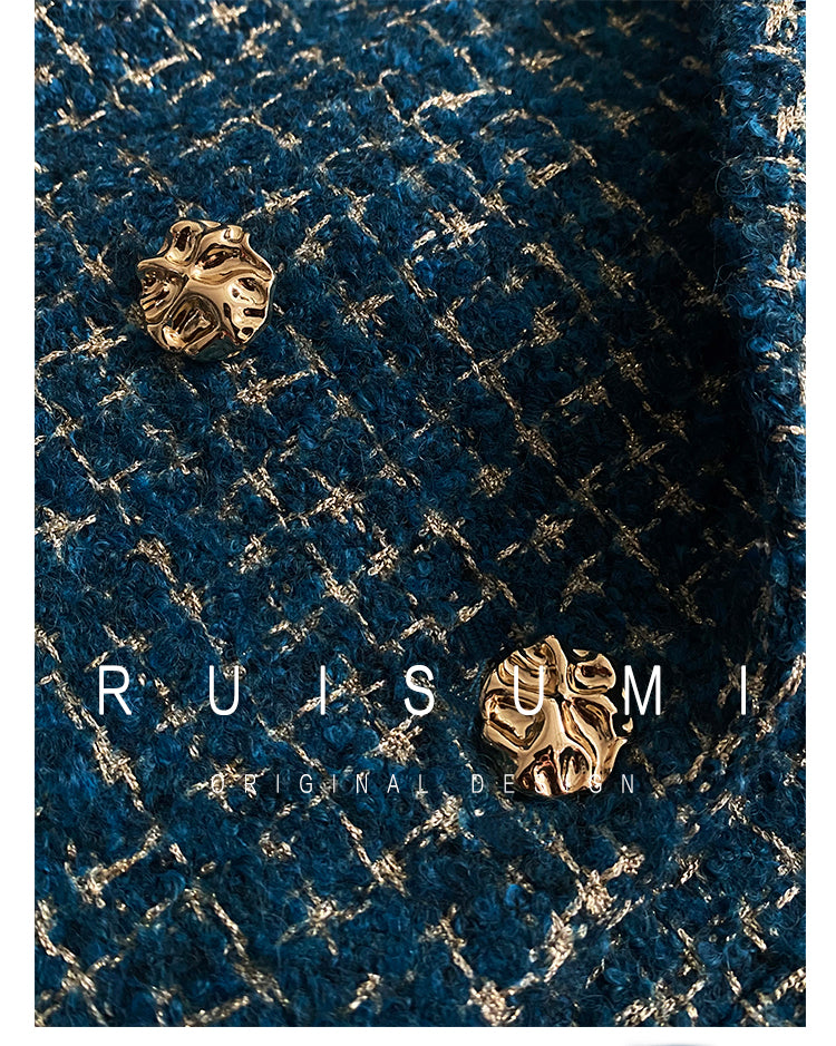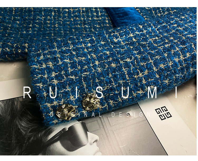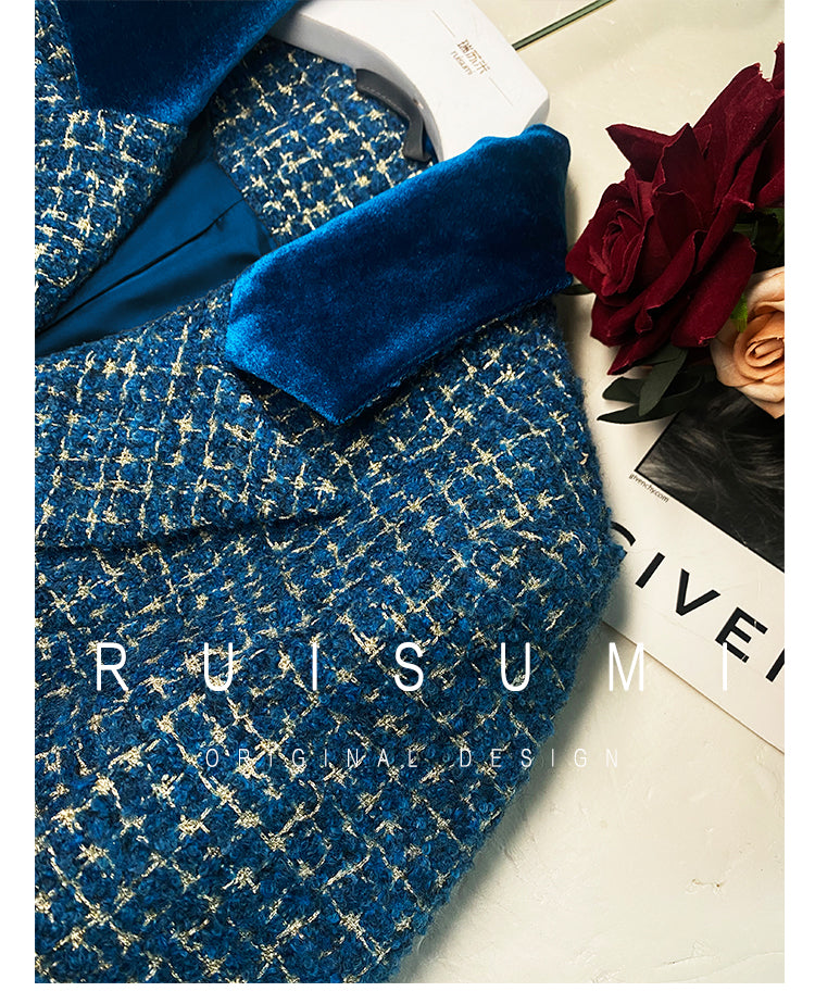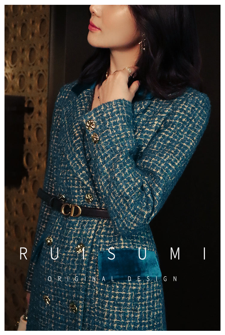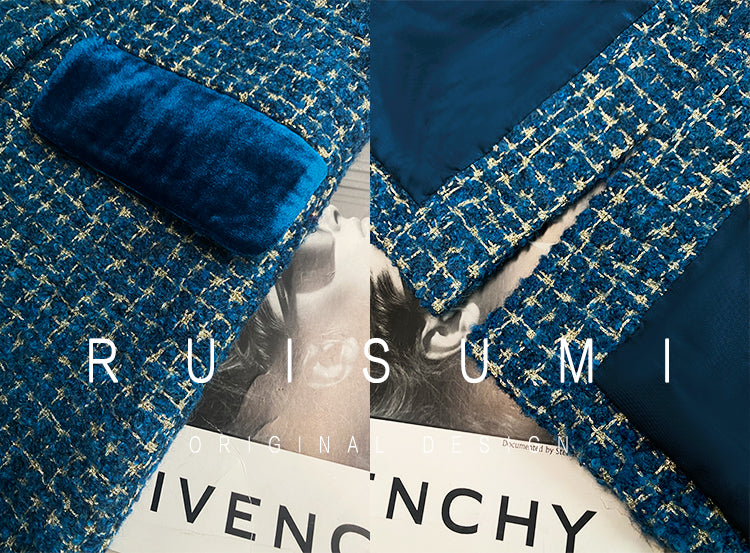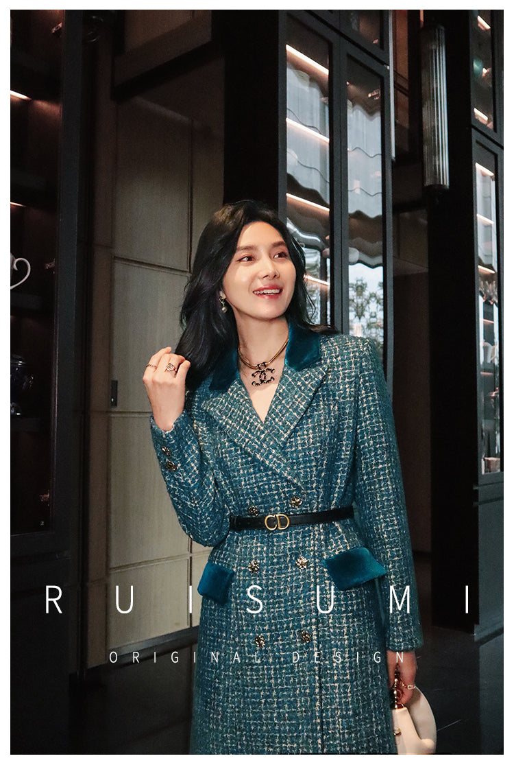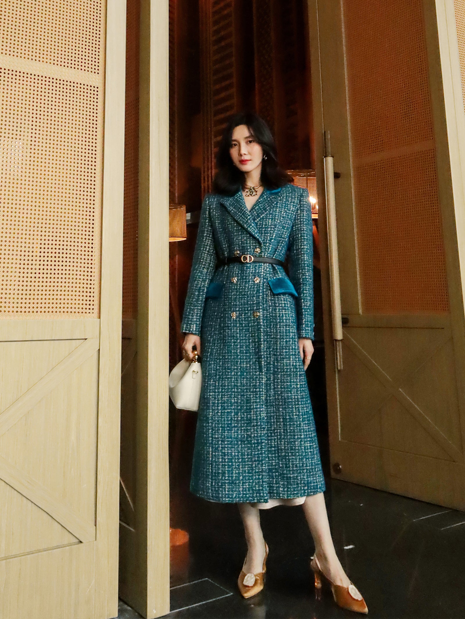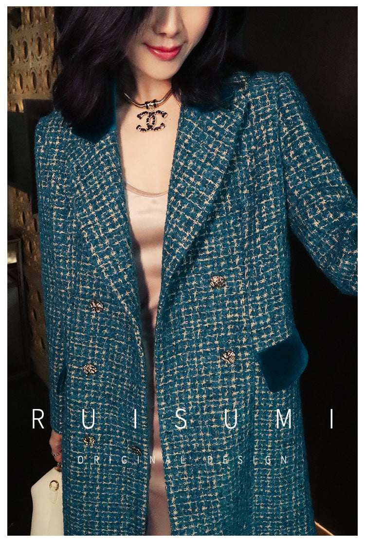 Lady's luxury high-end retro big peacock blue splicing bright silk design wool long coat- Jessy
