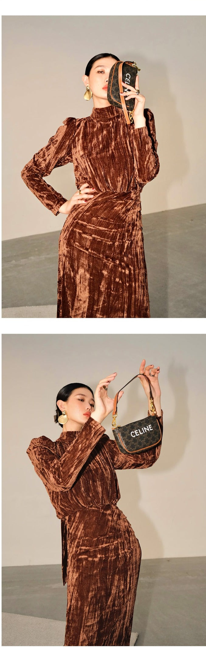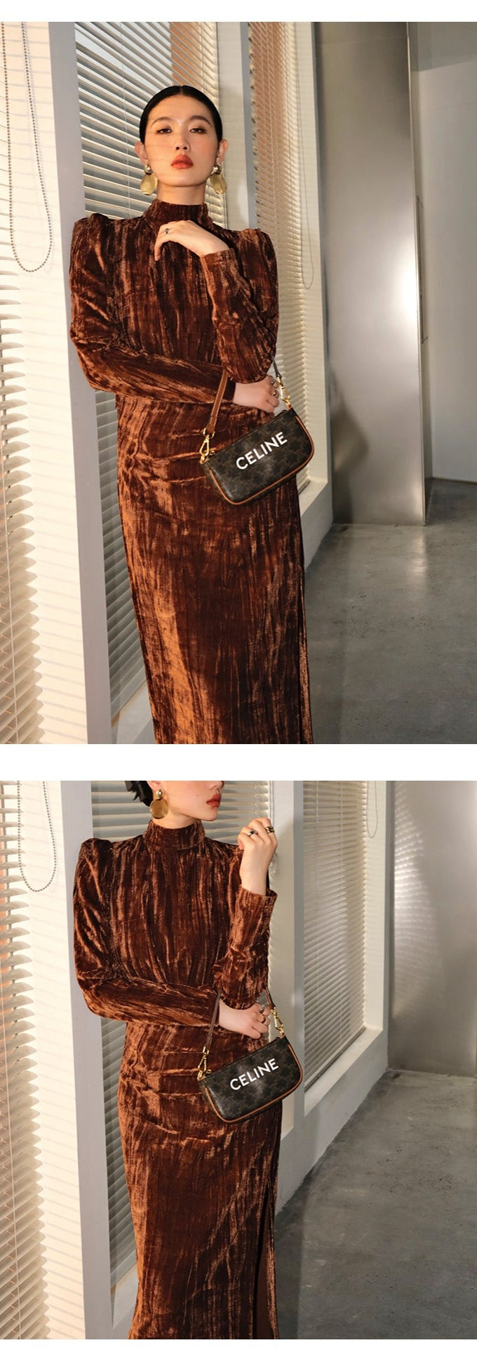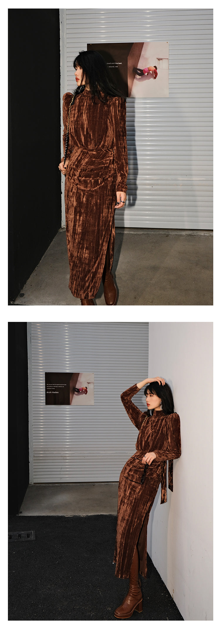 Vintage Retro highend half Turtleneck Side Slit Velvet dress - Kibeds cocoa brown
