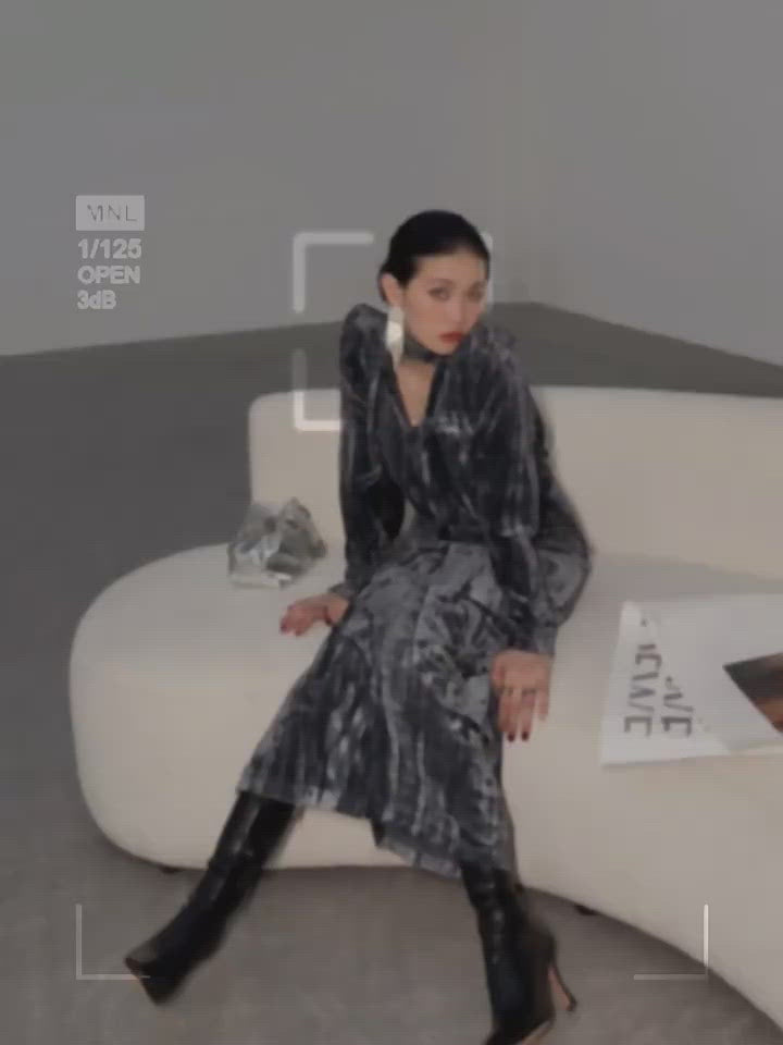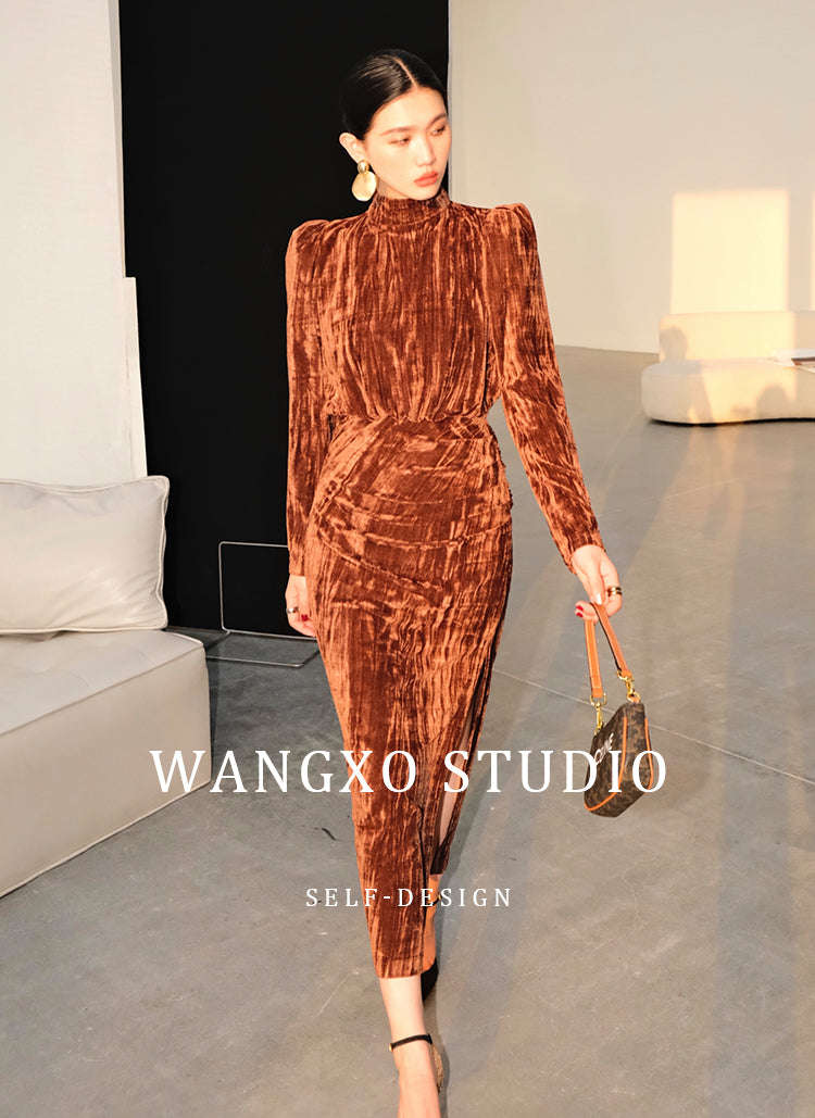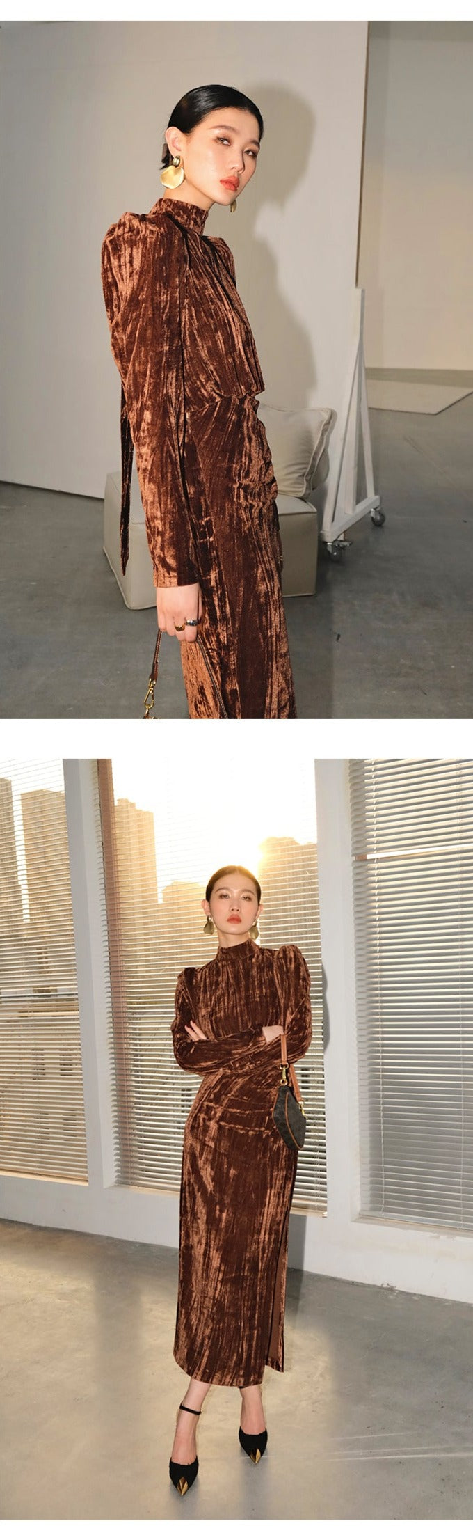 Vintage Retro highend half Turtleneck Side Slit Velvet dress - Kibeds cocoa brown
