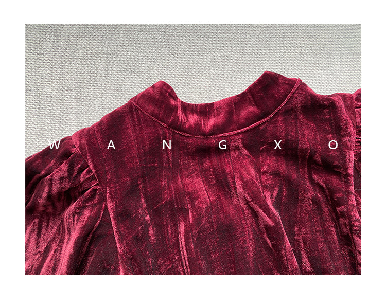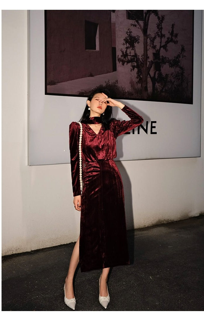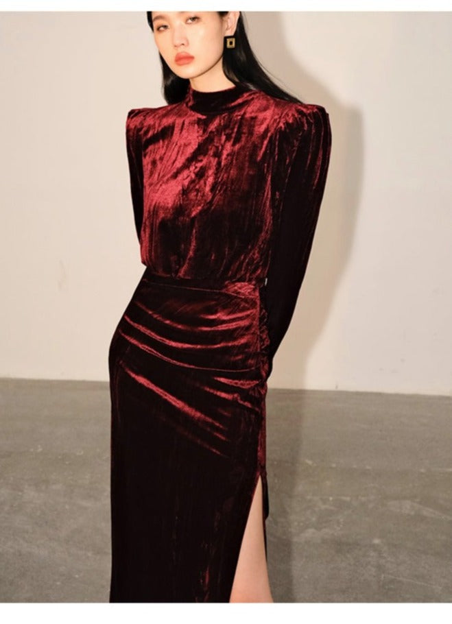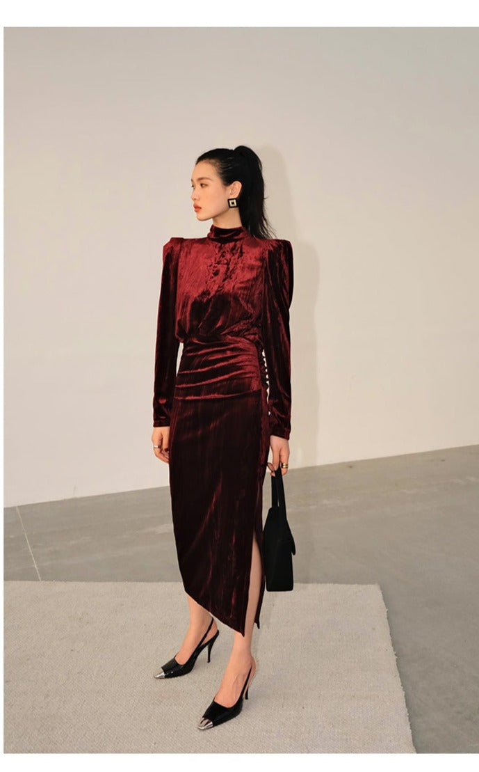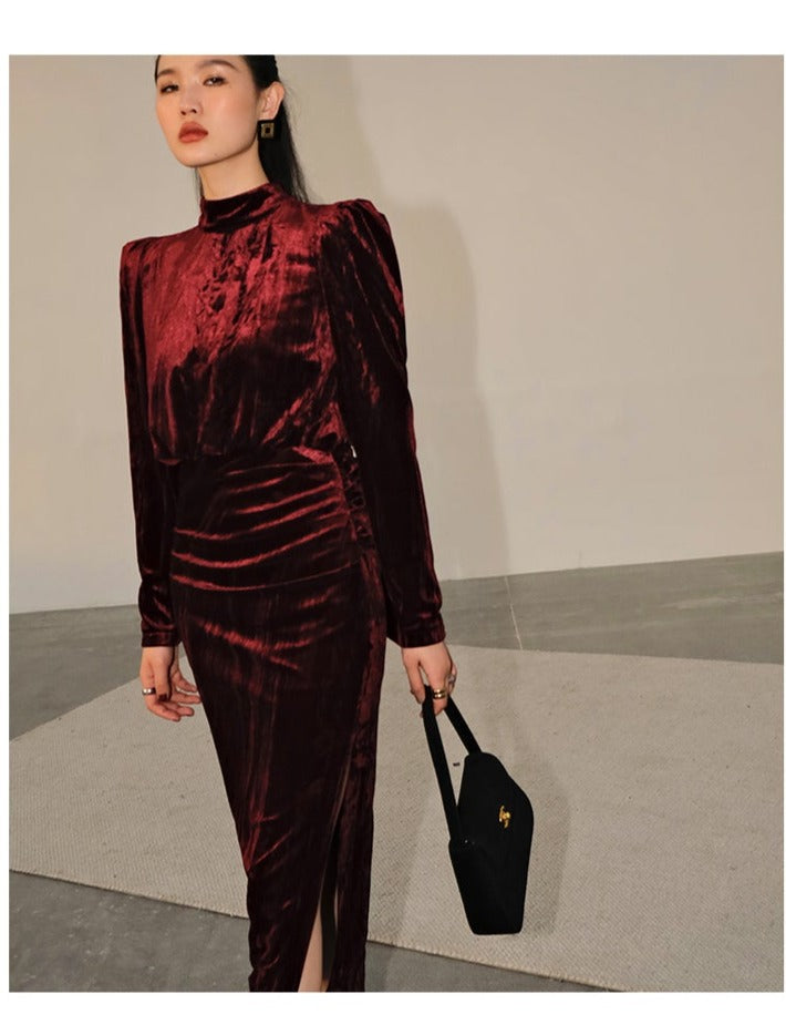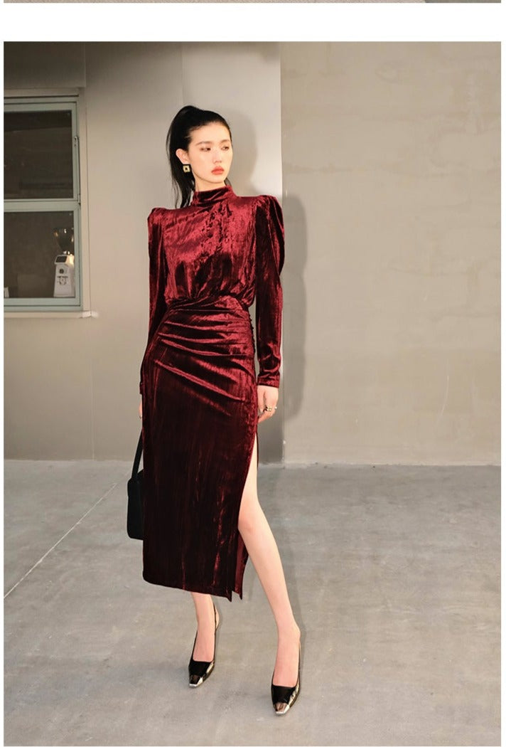 Vintage Retro highend half Turtleneck Side Slit Velvet dress - Kibeds Nissl Red